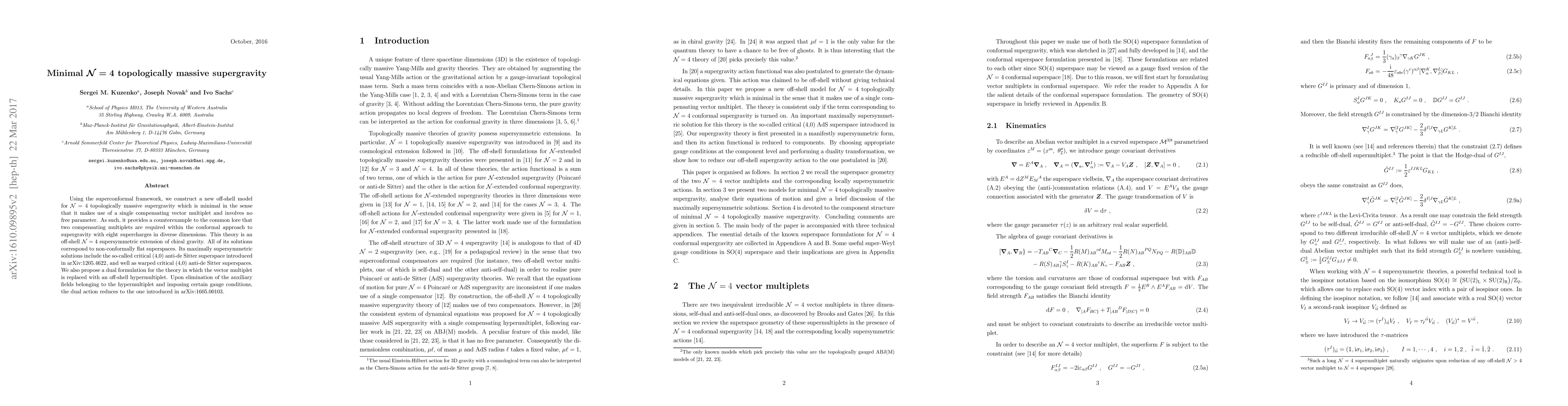 This paper constructs a new minimal off-shell model for $\cal N=4$ topologically massive supergravity using a single compensating vector multiplet, contradicting the requirement of two multiplets in conventional approaches. It extends chiral gravity and proposes a dual formulation via an off-shell hypermultiplet.