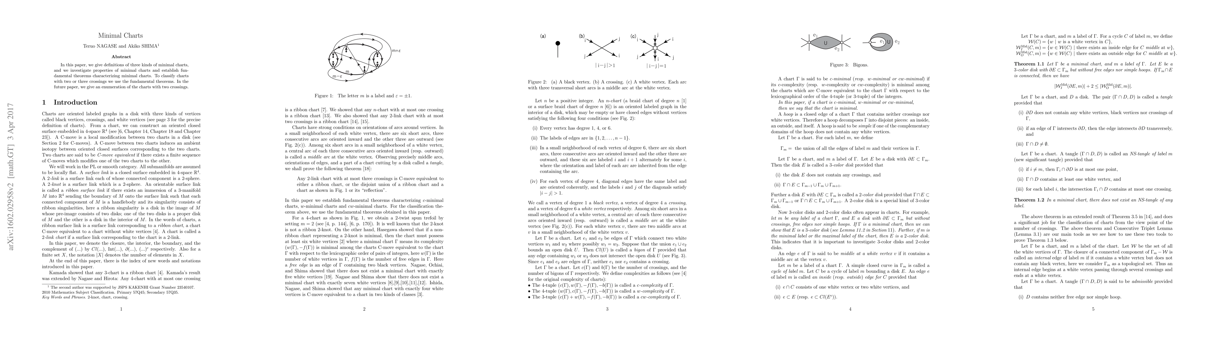 This paper defines three types of minimal charts, explores their properties, and establishes fundamental theorems to classify charts with two or three crossings. Future work will focus on numbering charts with two crossings.