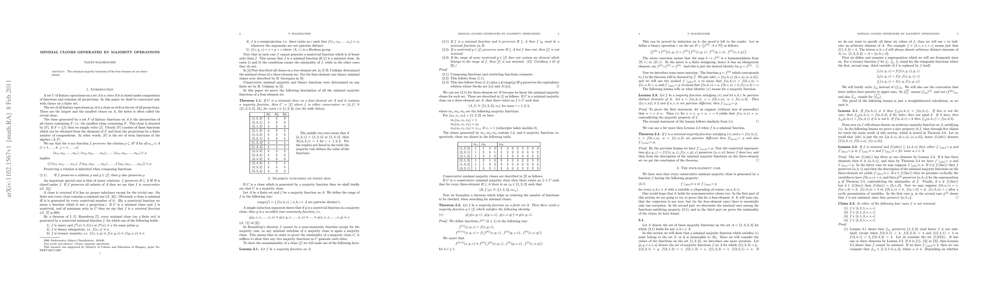 Summary: This paper identifies all majority operations on a four-element set that produce a minimal clone, providing a comprehensive analysis of the structure and properties of such operations. The findings contribute to the understanding of algebraic structures generated by majority functions.