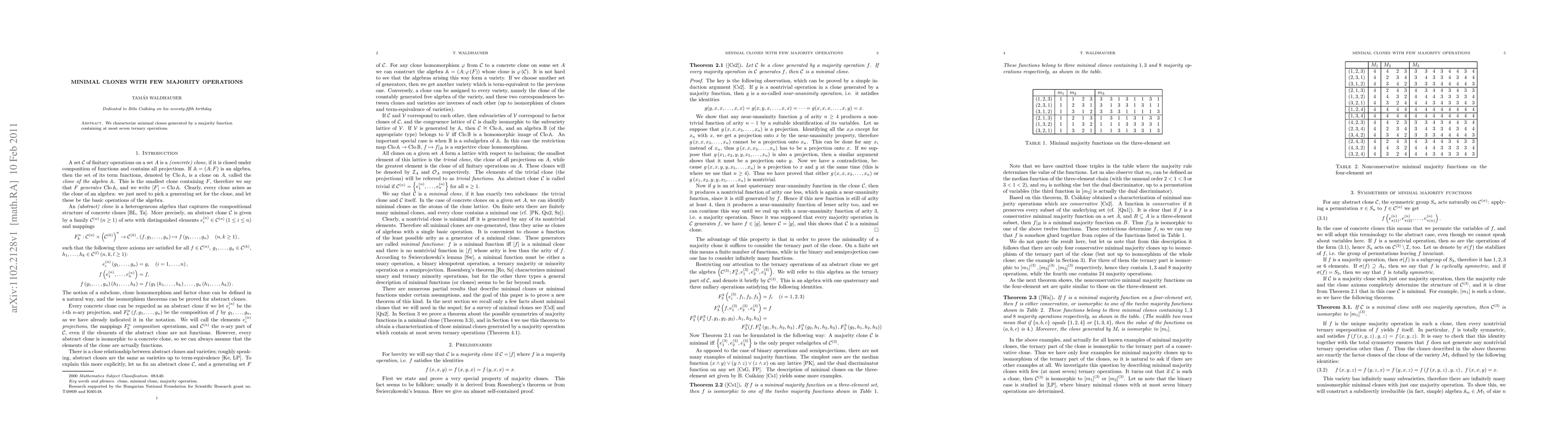 Provides a comprehensive classification of minimal clones generated by majority functions with at most seven ternary operations.