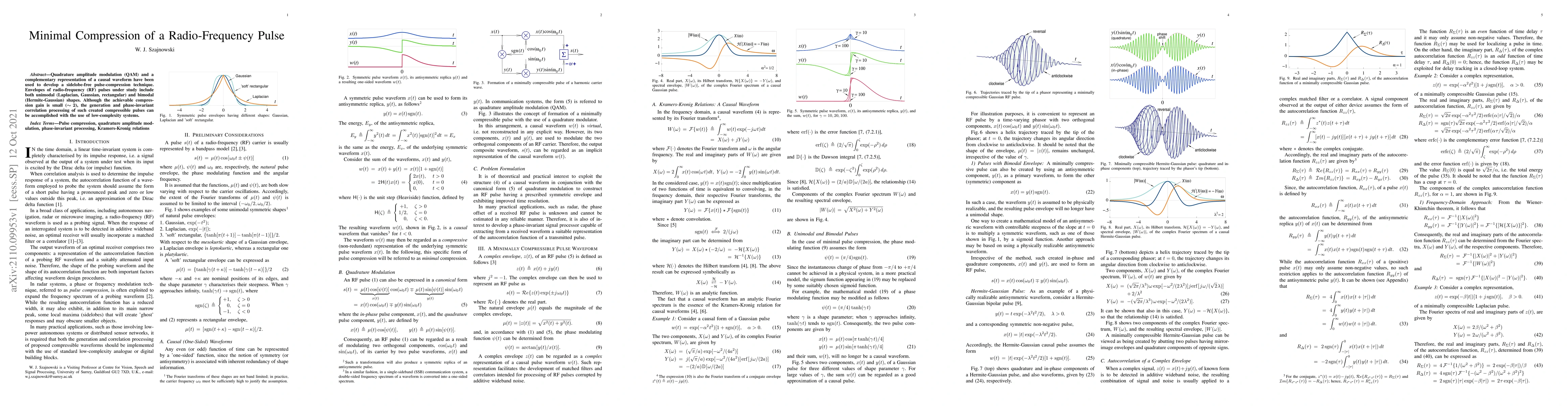 Quadrature amplitude modulation (QAM) and a complementary representation of a causal waveform have been used to develop a sidelobe-free pulse-compression technique. Envelopes of radio-frequency (RF) pulses under study include both unimodal (Laplacian, Gaussian, rectangular) and bimodal (Hermite-Gaussian) shapes. Although the achievable compression gain is small (~2), the generation and phase-invariant correlation processing of such created compressible pulses can be accomplished with the use of low-complexity systems.