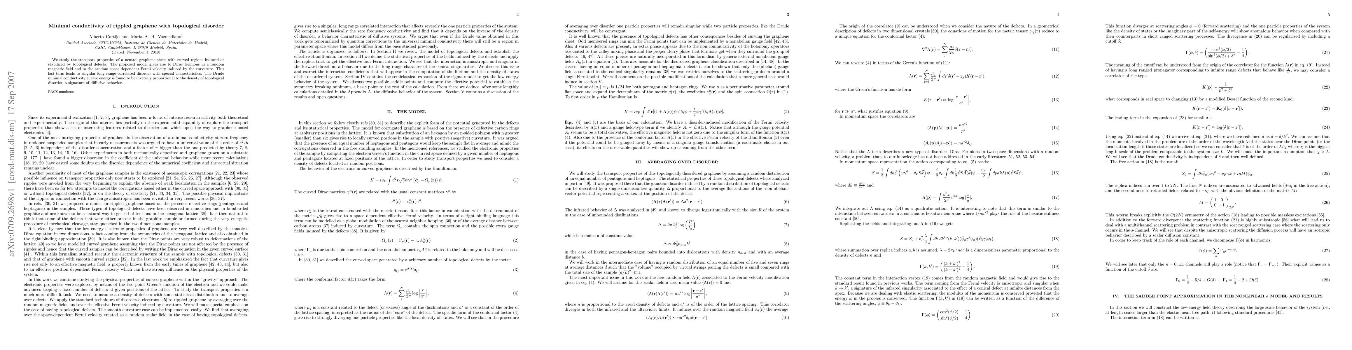 This study investigates the transport properties of rippled graphene with topological defects, revealing that the minimal conductivity is inversely proportional to the density of topological disorder, indicating diffusive behavior due to the random magnetic field and space-dependent Fermi velocity.