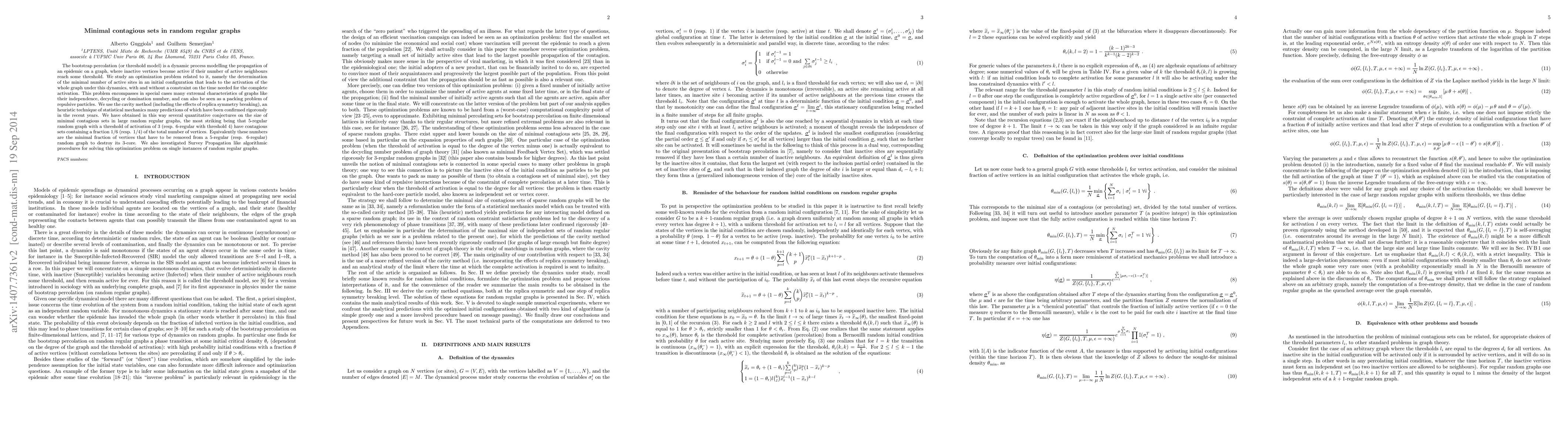 The bootstrap percolation (or threshold model) is a dynamic process modelling the propagation of an epidemic on a graph, where inactive vertices become active if their number of active neighbours reach some threshold. We study an optimization problem related to it, namely the determination of the minimal number of active sites in an initial configuration that leads to the activation of the whole graph under this dynamics, with and without a constraint on the time needed for the complete activation. This problem encompasses in special cases many extremal characteristics of graphs like their independence, decycling or domination number, and can also be seen as a packing problem of repulsive particles. We use the cavity method (including the effects of replica symmetry breaking), an heuristic technique of statistical mechanics many predictions of which have been confirmed rigorously in the recent years. We have obtained in this way several quantitative conjectures on the size of minimal contagious sets in large random regular graphs, the most striking being that 5-regular random graph with a threshold of activation of 3 (resp. 6-regular with threshold 4) have contagious sets containing a fraction 1/6 (resp. 1/4) of the total number of vertices. Equivalently these numbers are the minimal fraction of vertices that have to be removed from a 5-regular (resp. 6-regular) random graph to destroy its 3-core. We also investigated Survey Propagation like algorithmic procedures for solving this optimization problem on single instances of random regular graphs.