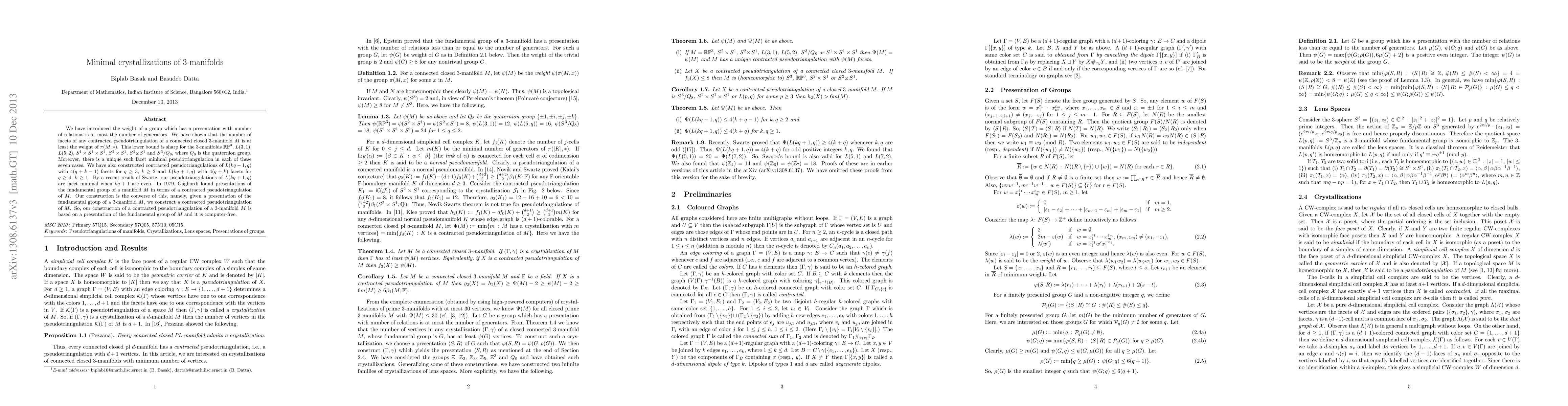 We have introduced the weight of a group which has a presentation with number of relations is at most the number of generators. We have shown that the number of facets of any contracted pseudotriangulation of a connected closed 3-manifold $M$ is at least the weight of $\pi(M, \ast)$. This lower bound is sharp for the 3-manifolds $\mathbb{R P}^3$, $L(3,1)$, $L(5,2)$, $S^1\times S^1 \times S^1$, $S^2 \times S^1$, $S^2 \mbox{$\times \hspace{-2.8mm}_{-}$} S^1$ and $S^3/Q_8$, where $Q_8$ is the quaternion group. Moreover, there is a unique such facet minimal pseudotriangulation in each of these seven cases. We have also constructed contracted pseudotriangulations of $L(kq-1,q)$ with $4(q+k-1)$ facets for $q \geq 3$, $k \geq 2$ and $L(kq+1,q)$ with $4(q+k)$ facets for $q\geq 4$, $k\geq 1$. By a recent result of Swartz, our pseudotriangulations of $L(kq+1, q)$ are facet minimal when $kq+1$ are even. In 1979, Gagliardi found presentations of the fundamental group of a manifold $M$ in terms of a contracted pseudotriangulation of $M$. Our construction is the converse of this, namely, given a presentation of the fundamental group of a 3-manifold $M$, we construct a contracted pseudotriangulation of $M$. So, our construction of a contracted pseudotriangulation of a 3-manifold $M$ is based on a presentation of the fundamental group of $M$ and it is computer-free.