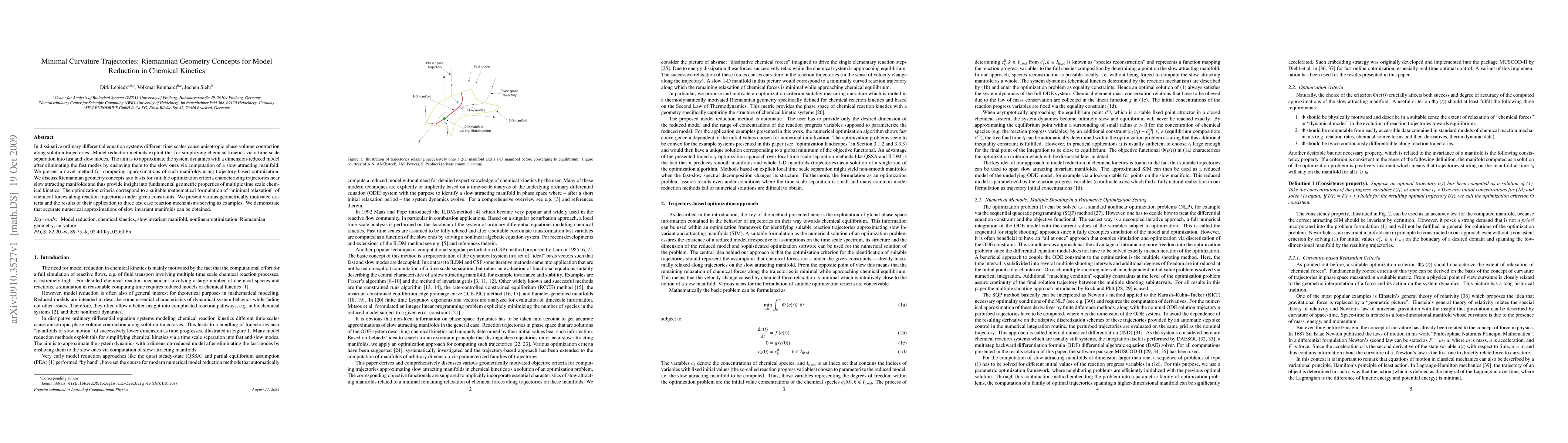 In dissipative ordinary differential equation systems different time scales cause anisotropic phase volume contraction along solution trajectories. Model reduction methods exploit this for simplifying chemical kinetics via a time scale separation into fast and slow modes. The aim is to approximate the system dynamics with a dimension-reduced model after eliminating the fast modes by enslaving them to the slow ones via computation of a slow attracting manifold. We present a novel method for computing approximations of such manifolds using trajectory-based optimization. We discuss Riemannian geometry concepts as a basis for suitable optimization criteria characterizing trajectories near slow attracting manifolds and thus provide insight into fundamental geometric properties of multiple time scale chemical kinetics. The optimization criteria correspond to a suitable mathematical formulation of "minimal relaxation" of chemical forces along reaction trajectories under given constraints. We present various geometrically motivated criteria and the results of their application to three test case reaction mechanisms serving as examples. We demonstrate that accurate numerical approximations of slow invariant manifolds can be obtained.