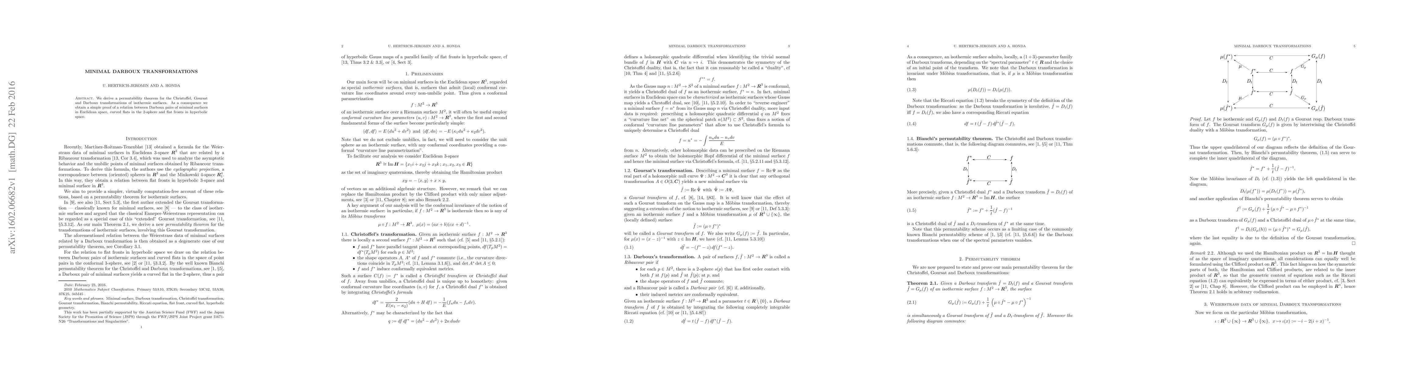 This paper derives a permutability theorem for Christoffel, Goursat, and Darboux transformations in isothermic surfaces, leading to a straightforward proof of the relationship between minimal surfaces in Euclidean space, curved flats in the 2-sphere, and flat fronts in hyperbolic space.