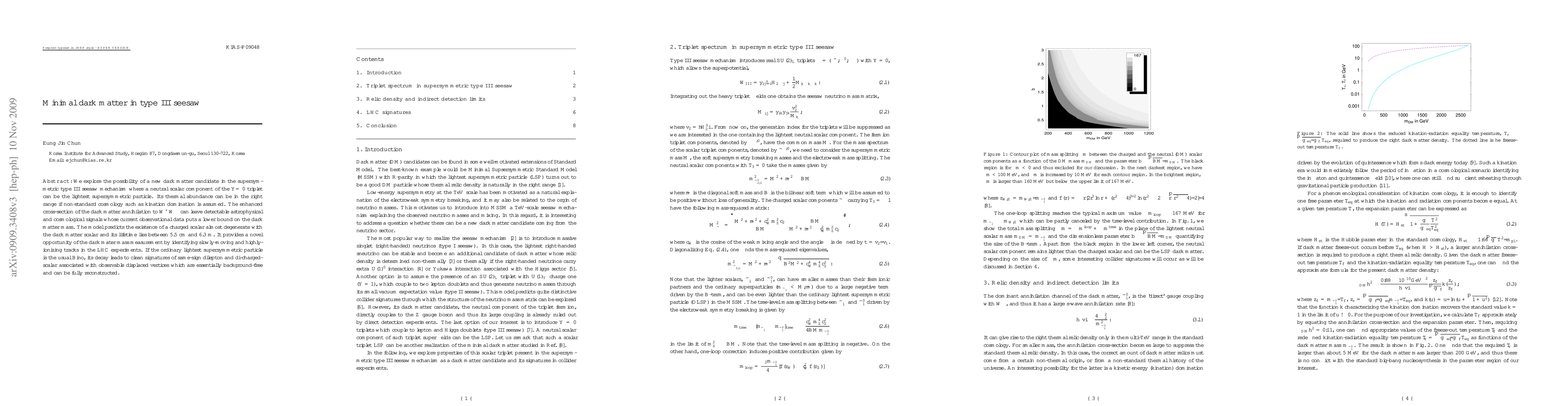 We explore the possibility of a new dark matter candidate in the supersymmetric type III seesaw mechanism where a neutral scalar component of the Y=0 triplet can be the lightest supersymmetric particle. Its thermal abundance can be in the right range if non-standard cosmology such as kination domination is assumed. The enhanced cross-section of the dark matter annihilation to W+W- can leave detectable astrophysical and cosmological signals whose current observational data puts a lower bound on the dark matter mass. The model predicts the existence of a charged scalar almost degenerate with the dark matter scalar and its lifetime lies between 5.5 cm and 6.3 m. It provides a novel opportunity of the dark mater mass measurement by identifying slowly-moving and highly-ionizing tracks in the LHC experiments. If the ordinary lightest supersymmetric particle is the usual Bino, its decay leads to clean signatures of same-sign di-lepton and di-charged-scalar associated with observable displaced vertices which are essentially background-free and can be fully reconstructed.