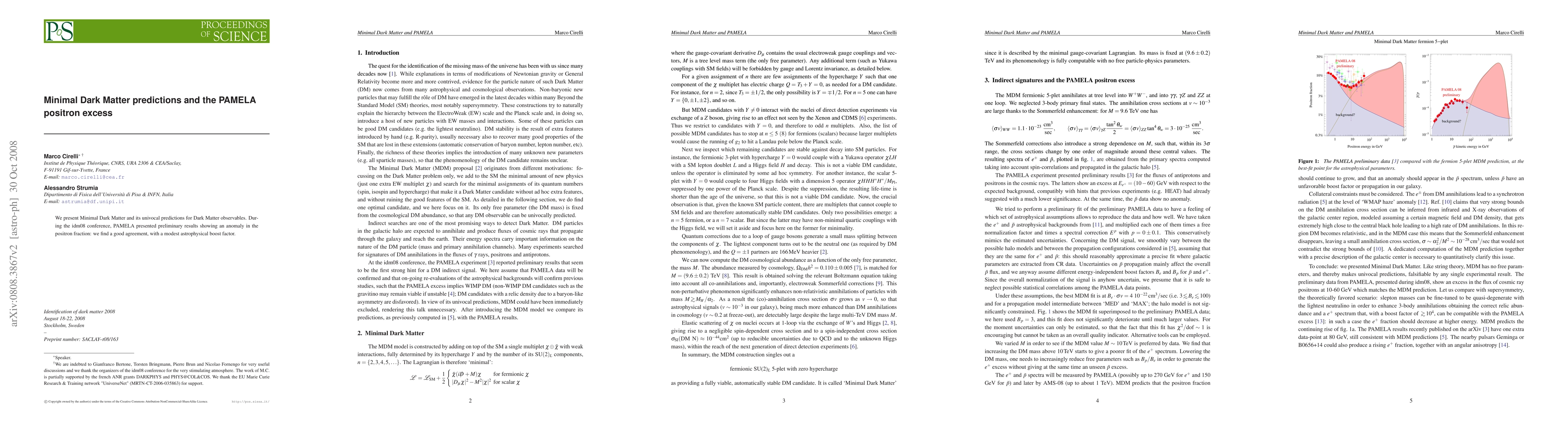 Summary: This paper introduces Minimal Dark Matter, aligning its predictions with the observed positron excess from PAMELA data, suggesting a modest astrophysical boost factor as a plausible explanation.