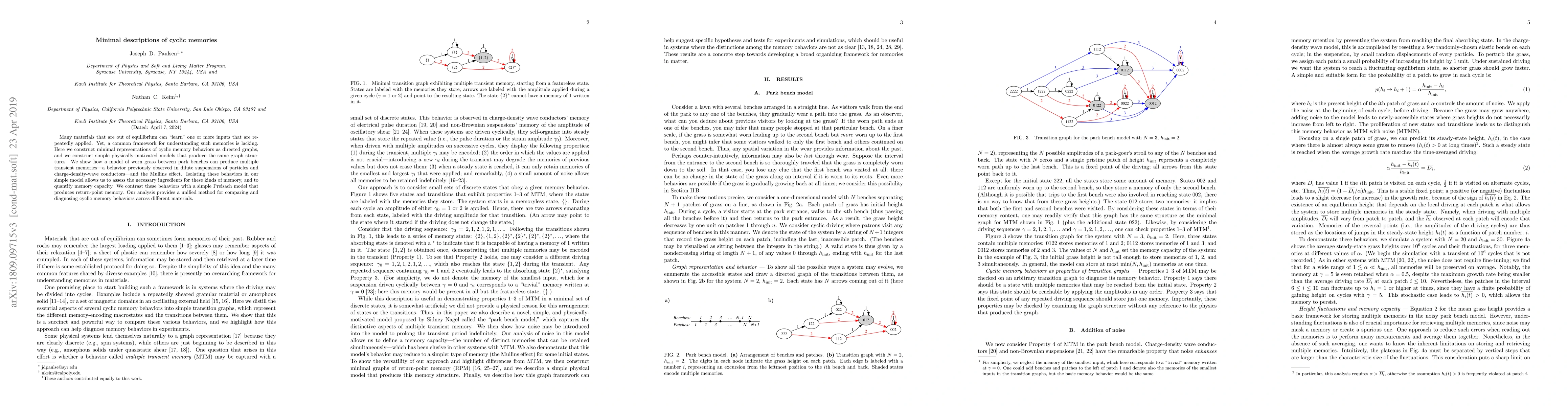 Many materials that are out of equilibrium can "learn" one or more inputs that are repeatedly applied. Yet, a common framework for understanding such memories is lacking. Here we construct minimal representations of cyclic memory behaviors as directed graphs, and we construct simple physically-motivated models that produce the same graph structures. We show how a model of worn grass between park benches can produce multiple transient memories---a behavior previously observed in dilute suspensions of particles and charge-density-wave conductors---and the Mullins effect. Isolating these behaviors in our simple model allows us to assess the necessary ingredients for these kinds of memory, and to quantify memory capacity. We contrast these behaviors with a simple Preisach model that produces return-point memory. Our analysis provides a unified method for comparing and diagnosing cyclic memory behaviors across different materials.