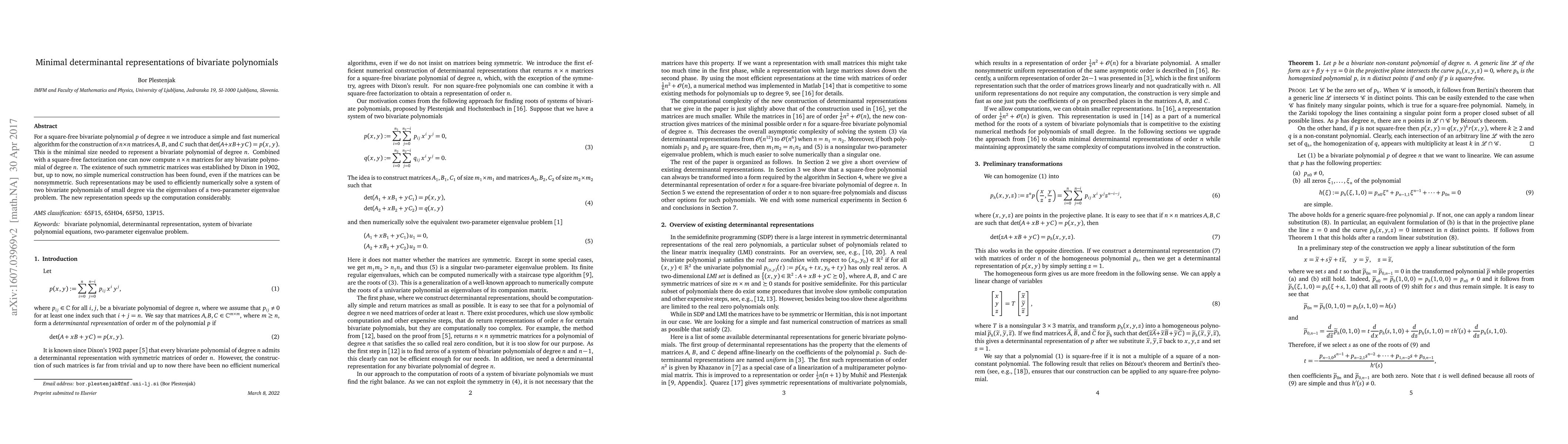 For a square-free bivariate polynomial $p$ of degree $n$ we introduce a simple and fast numerical algorithm for the construction of $n\times n$ matrices $A$, $B$, and $C$ such that $\det(A+xB+yC)=p(x,y)$. This is the minimal size needed to represent a bivariate polynomial of degree $n$. Combined with a square-free factorization one can now compute $n \times n$ matrices for any bivariate polynomial of degree $n$. The existence of such symmetric matrices was established by Dixon in 1902, but, up to now, no simple numerical construction has been found, even if the matrices can be nonsymmetric. Such representations may be used to efficiently numerically solve a system of two bivariate polynomials of small degree via the eigenvalues of a two-parameter eigenvalue problem. The new representation speeds up the computation considerably.