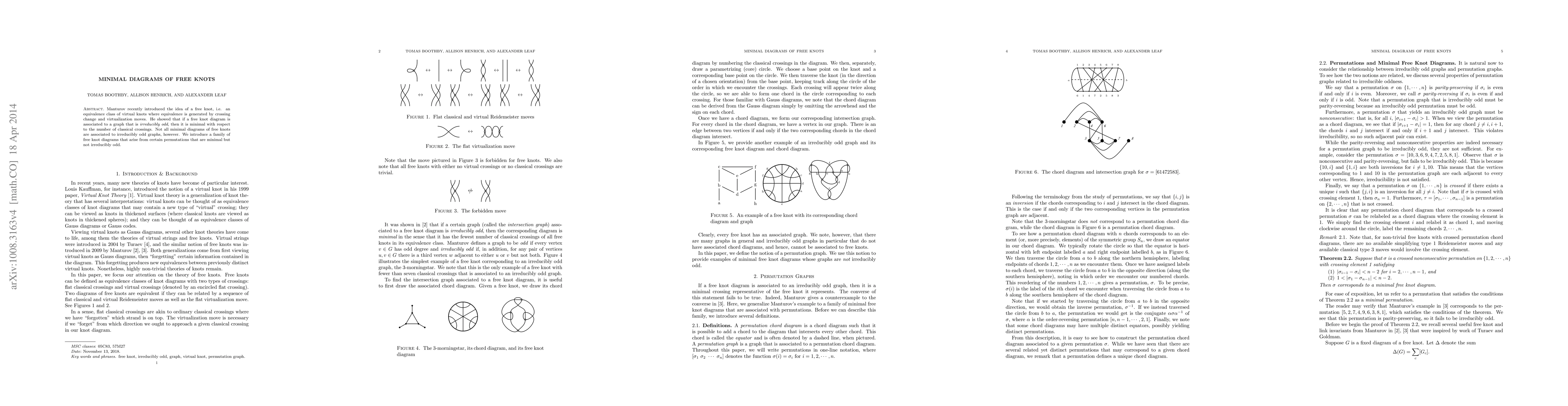 Manturov recently introduced the idea of a free knot, i.e. an equivalence class of virtual knots where equivalence is generated by crossing change and virtualization moves. He showed that if a free knot diagram is associated to a graph that is irreducibly odd, then it is minimal with respect to the number of classical crossings. Not all minimal diagrams of free knots are associated to irreducibly odd graphs, however. We introduce a family of free knot diagrams that arise from certain permutations that are minimal but not irreducibly odd.