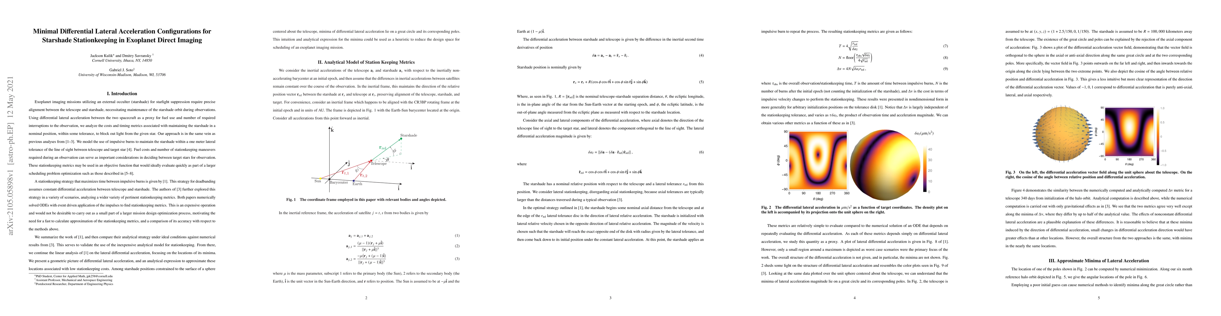 This paper investigates optimal configurations for maintaining the alignment of a starshade with a telescope, minimizing differential lateral acceleration to reduce fuel use and observation interruptions. It finds that minimal acceleration configurations lie on a great circle on the starshade's surface and provides a closed expression for the telescope-to-star vectors that achieve this minimal stationkeeping.