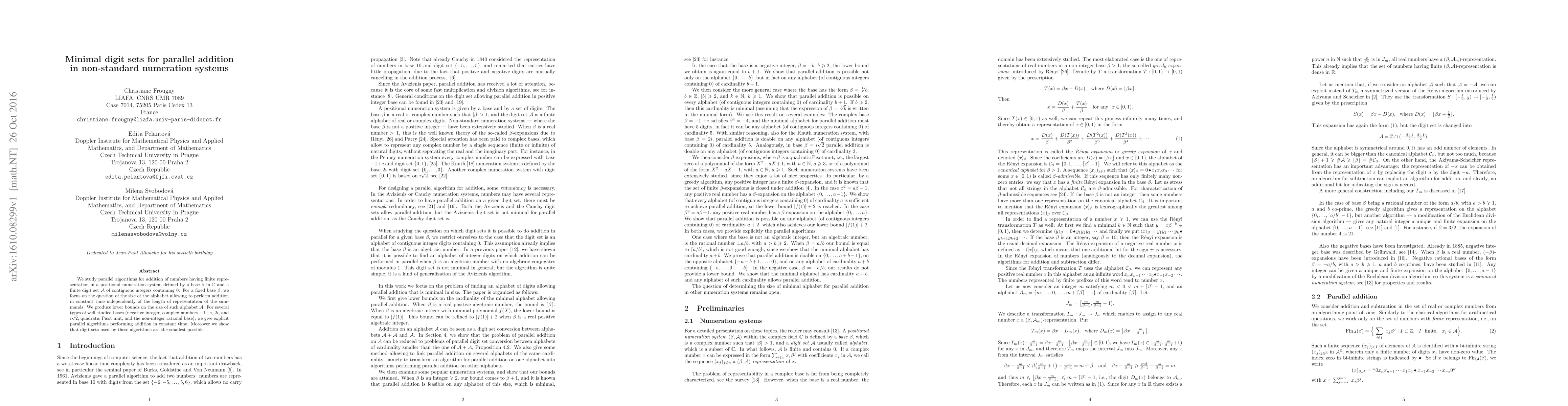 This paper investigates parallel algorithms for addition in non-standard numeration systems, focusing on determining the minimum digit set size for constant-time addition. It provides explicit algorithms for various bases, proving that the digit sets used are optimal.