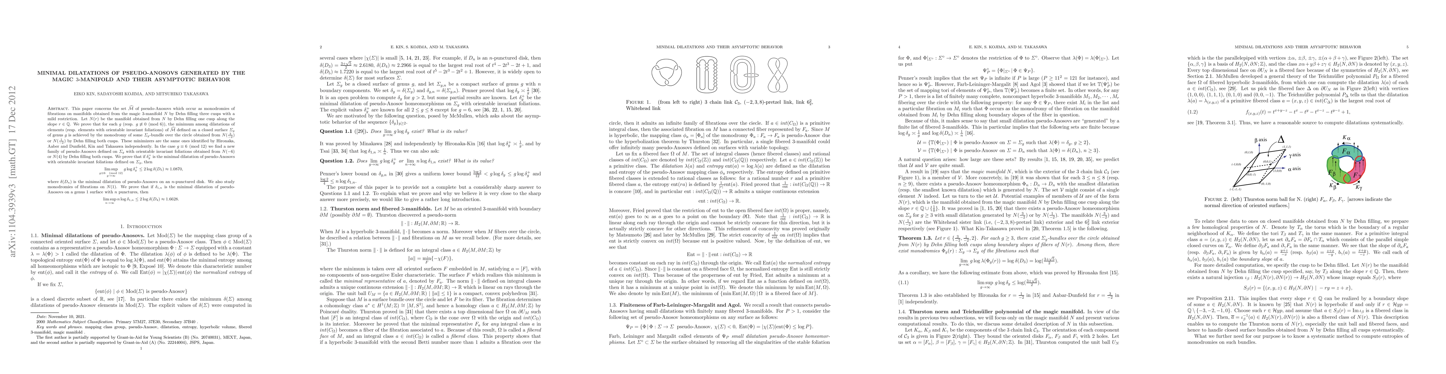 This paper concerns the set $\hat{\mathcal{M}}$ of pseudo-Anosovs which occur as monodromies of fibrations on manifolds obtained from the magic 3-manifold $N$ by Dehn filling three cusps with a mild restriction. We prove that for each $g$ (resp. $g \not\equiv 0 \pmod{6}$), the minimum among dilatations of elements (resp. elements with orientable invariant foliations) of $\hat{\mathcal{M}}$ defined on a closed surface $\varSigma_g$ of genus $g$ is achieved by the monodromy of some $\varSigma_g$-bundle over the circle obtained from $N(\tfrac{3}{-2})$ or $N(\tfrac{1}{-2})$ by Dehn filling two cusps. These minimizers are the same ones identified by Hironaka, Aaber-Dunfiled, Kin-Takasawa independently. In the case $g \equiv 6 \pmod{12}$ we find a new family of pseudo-Anosovs defined on $\varSigma_g$ with orientable invariant foliations obtained from N(-6) or N(4) by Dehn filling two cusps. We prove that if $\delta_g^+$ is the minimal dilatation of pseudo-Anosovs with orientable invariant foliations defined on $\varSigma_g$, then $$ \limsup_{\substack{g \equiv 6 \pmod{12} g \to \infty}} g \log \delta^+_g \le 2 \log \delta(D_5) \approx 1.0870,$$ where $\delta(D_n)$ is the minimal dilatation of pseudo-Anosovs on an $n$-punctured disk. We also study monodromies of fibrations on N(1). We prove that if $\delta_{1,n}$ is the minimal dilatation of pseudo-Anosovs on a genus 1 surface with $n$ punctures, then $$ \limsup_{n \to \infty} n \log \delta_{1,n} \le 2 \log \delta(D_4) \approx 1.6628. $$
