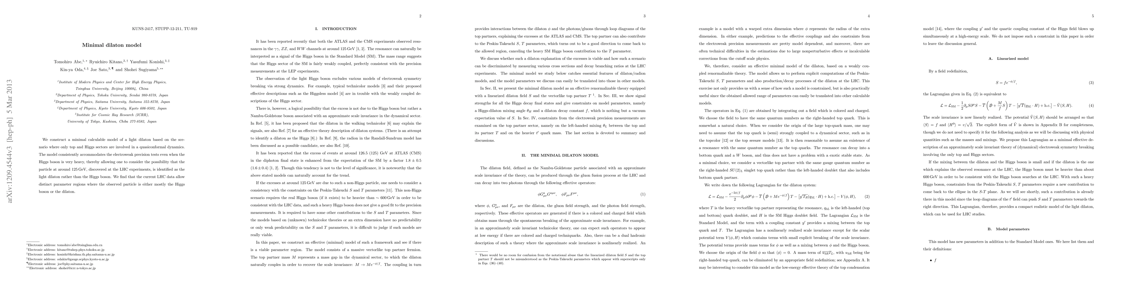 This paper constructs a minimal model for a light dilaton involving top and Higgs sectors, which accommodates electroweak precision tests even with a heavy Higgs. It suggests that the observed 125GeV particle at the LHC could be a light dilaton rather than the standard Higgs boson, with current LHC data supporting both possibilities.
