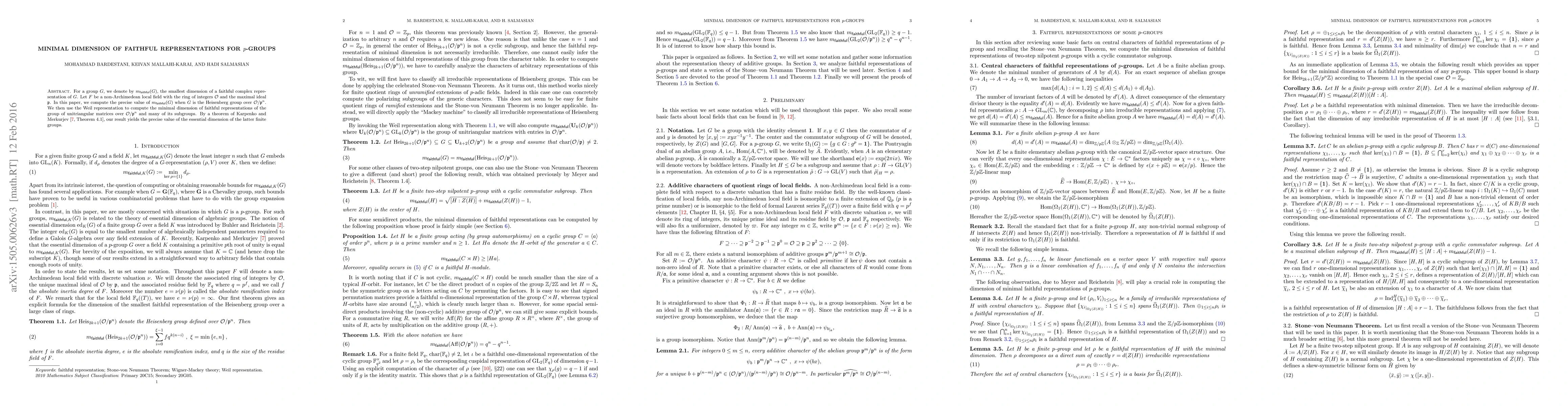 For a group $G$, we denote by $m_{faithful}(G)$, the smallest dimension of a faithful complex representation of $G$. Let $F$ be a non-Archimedean local field with the ring of integers $\mathcal{O}$ and the maximal ideal $\mathfrak{p}$. In this paper, we compute the precise value of $m_{faithful}(G)$ when $G$ is the Heisenberg group over $\mathcal{O}/\mathfrak{p}^n$. We then use the Weil representation to compute the minimal dimension of faithful representations of the group of unitriangular matrices over $\mathcal{O}/\mathfrak{p}^n$ and many of its subgroups. By a theorem of Karpenko and Merkurjev, our result yields the precise value of the essential dimension of the latter finite groups.