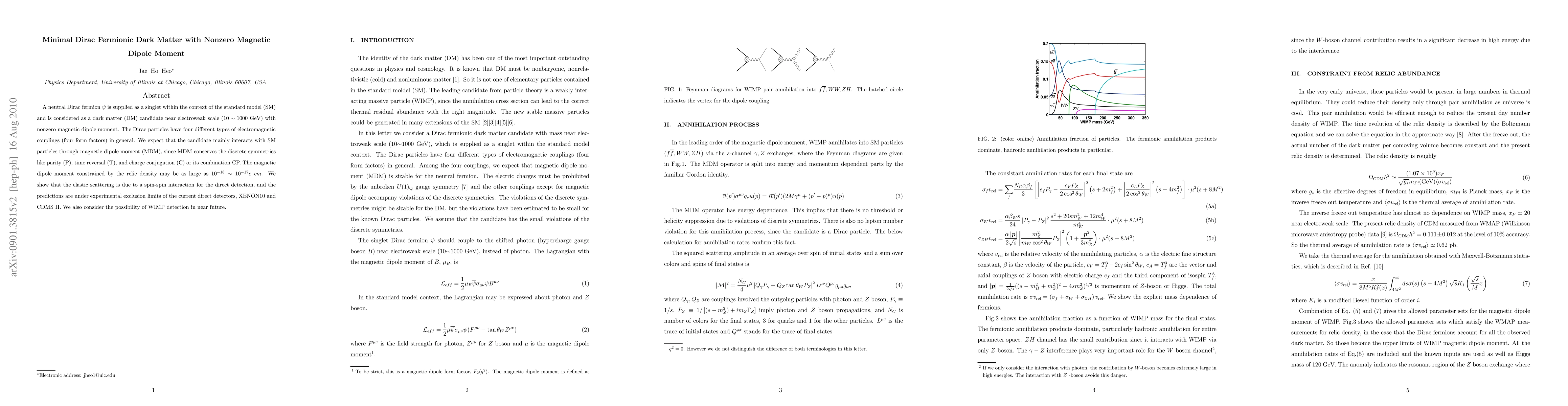 This paper proposes a neutral Dirac fermion as a dark matter candidate near the electroweak scale, emphasizing its interaction via a nonzero magnetic dipole moment. The predicted magnetic dipole moment, constrained by relic density, could be as large as 10^(-18)-10^(-17)e cm, and the candidate is currently under experimental limits of detectors like XENON10 and CDMS II.