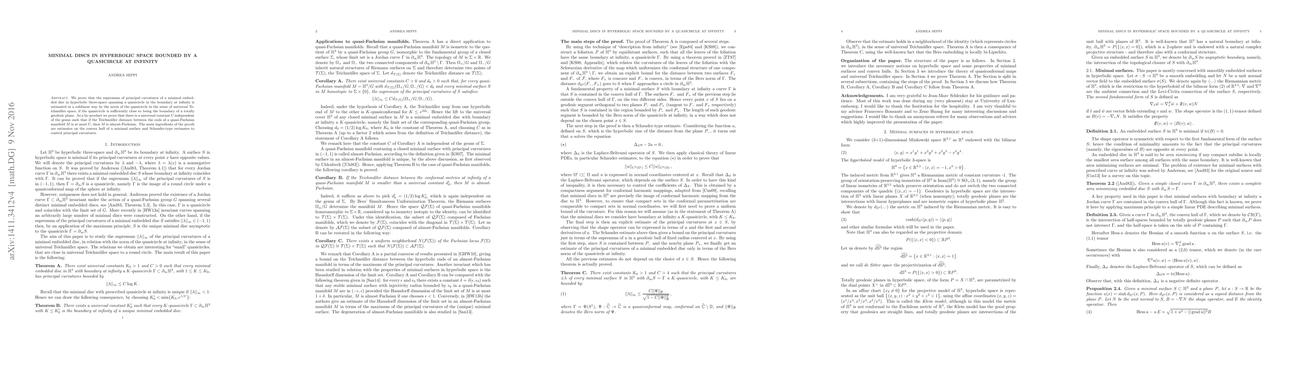 We prove that the supremum of principal curvatures of a minimal embedded disc in hyperbolic three-space spanning a quasicircle in the boundary at infinity is estimated in a sublinear way by the norm of the quasicircle in the sense of universal Teichm\"uller space, if the quasicircle is sufficiently close to being the boundary of a totally geodesic plane. As a by-product we prove that there is a universal constant C independent of the genus such that if the Teichm\"uller distance between the ends of a quasi-Fuchsian manifold $M$ is at most C, then $M$ is almost-Fuchsian. The main ingredients of the proofs are estimates on the convex hull of a minimal surface and Schauder-type estimates to control principal curvatures.