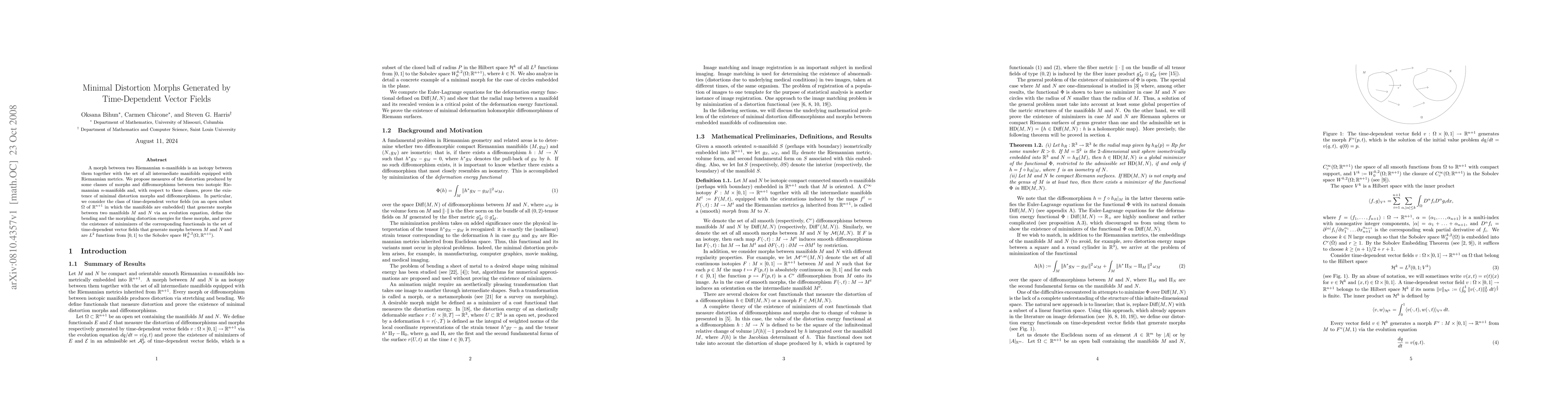 Researchers prove the existence of minimal distortion morphs between two isotopic Riemannian manifolds, generated by time-dependent vector fields with specific properties.