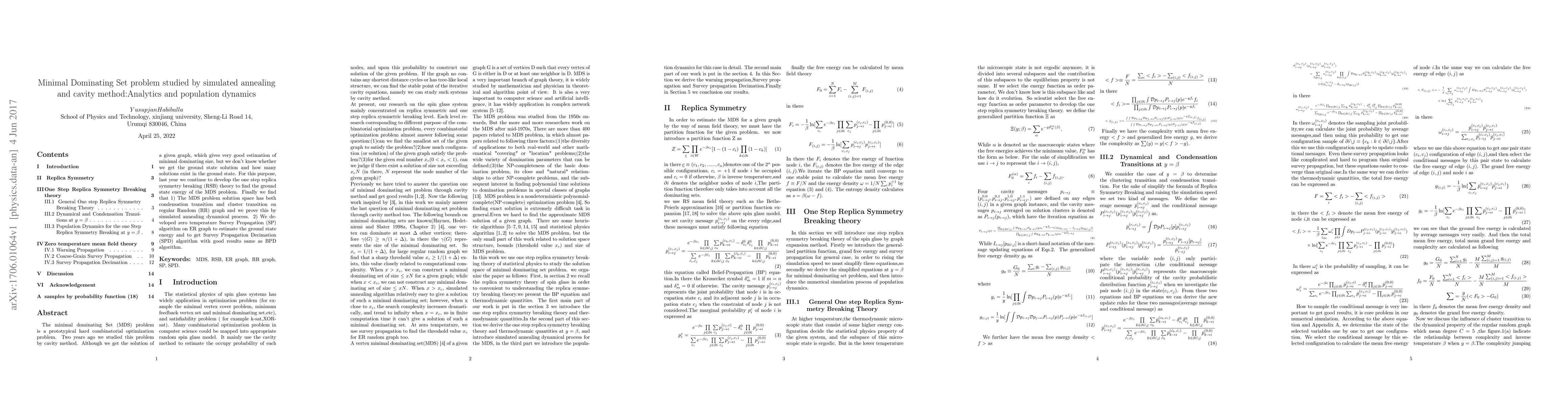 The minimal dominating Set (MDS) problem is a prototypical hard combinatorial optimization problem. Two years ago we studied this problem by cavity method. Although we get the solution of a given graph, which gives very good estimation of minimal dominating size, but we don't know whether we get the ground state solution and how many solutions exist in the ground state. For this purpose, last year we continue to develop the one step replica symmetry breaking (RSB) theory to find the ground state energy of the MDS problem. Finally we find that 1) The MDS problem solution space has both condensation transition and cluster transition on regular Random (RR) graph and we prove this by simulated annealing dynamical process. 2) We developed zero temperature Survey Propagation (SP) algorithm on ER graph to estimate the ground state energy and to get Survey Propagation Decimation (SPD) algorithm with good results same as BPD algorithm.