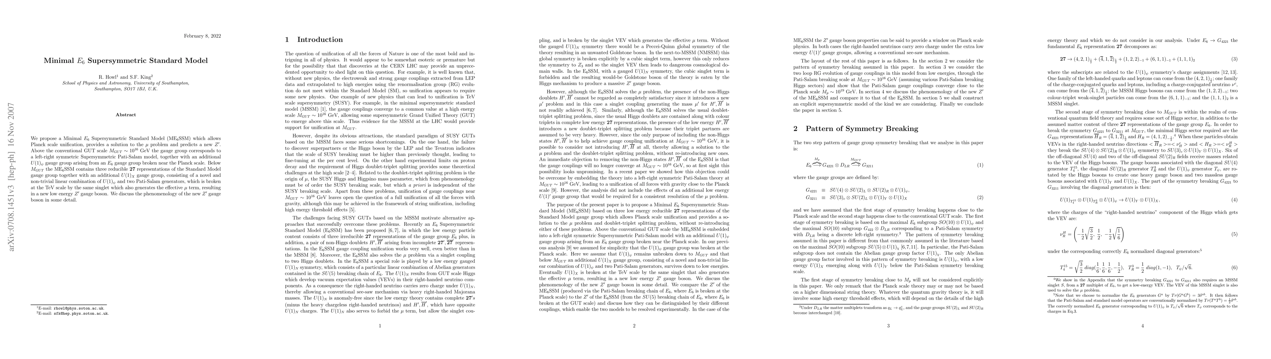 The Minimal E_6 Supersymmetric Standard Model (ME$_6$SSM) proposes a framework for Planck scale unification and a solution to the $\mu$ problem, predicting a new Z' boson. It extends beyond the conventional GUT scale with a left-right symmetric Supersymmetric Pati-Salam model and an additional $U(1)_{\psi}$ gauge group.