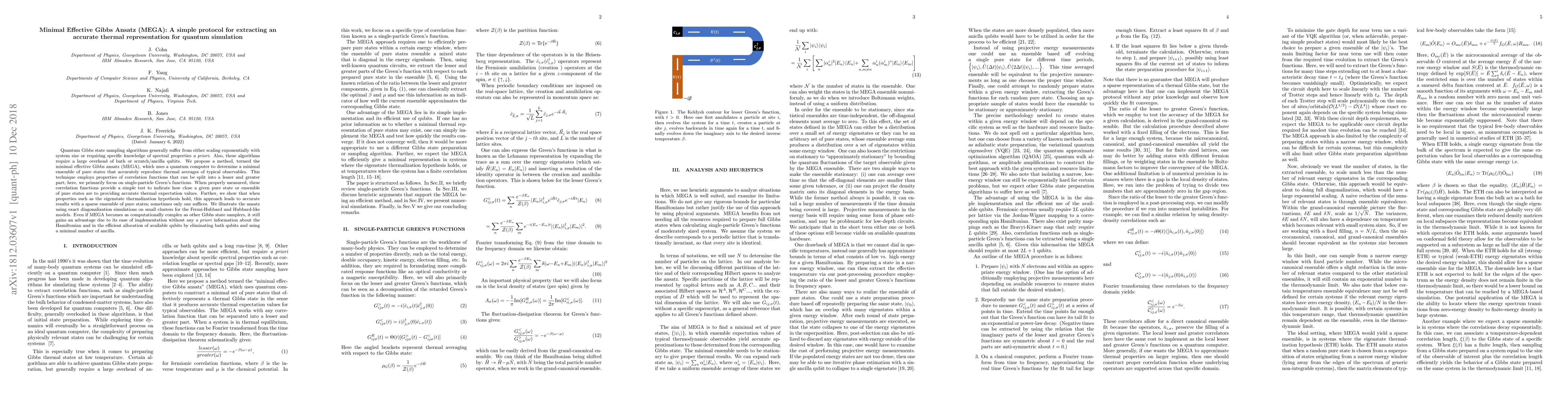 Quantum Gibbs state sampling algorithms generally suffer from either scaling exponentially with system size or requiring specific knowledge of spectral properties \textit{a priori}. Also, these algorithms require a large overhead of bath or scratch/ancilla qubits. We propose a method, termed the minimal effective Gibbs ansatz (MEGA), which uses a quantum computer to determine a minimal ensemble of pure states that accurately reproduce thermal averages of typical observables. This technique employs properties of correlation functions that can be split into a lesser and greater part; here, we primarily focus on single-particle Green's functions. When properly measured, these correlation functions provide a simple test to indicate how close a given pure state or ensemble of pure states are to providing accurate thermal expectation values. Further, we show that when properties such as the eigenstate thermalization hypothesis hold, this approach leads to accurate results with a sparse ensemble of pure states; sometimes only one suffices. We illustrate the ansatz using exact diagonalization simulations on small clusters for the Fermi-Hubbard and Hubbard-like models. Even if MEGA becomes as computationally complex as other Gibbs state samplers, it still gains an advantage due to its ease of implementation without any \textit{a priori} information about the Hamiltonian and in the efficient allocation of available qubits by eliminating bath qubits and using a minimal number of ancilla.