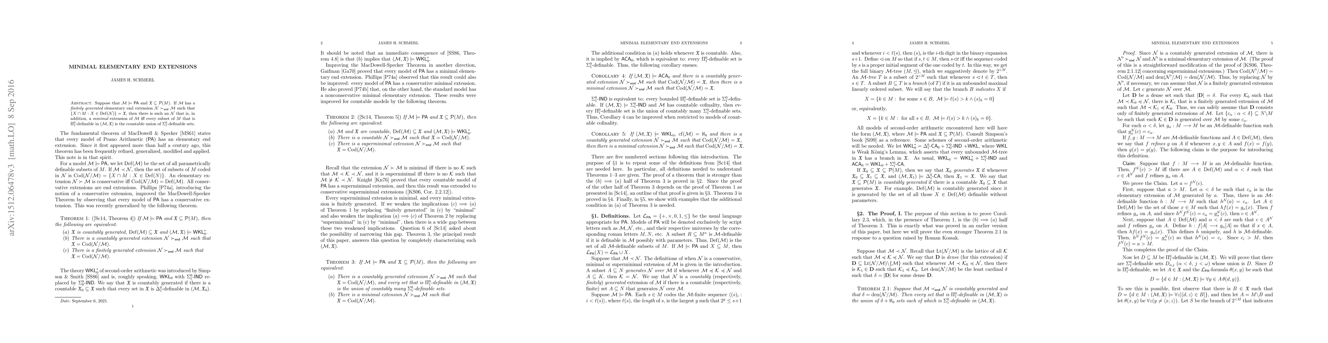 Suppose that ${\mathcal M}$ is a model of PA and ${\mathcal N}$ is a countably generated elementary end extension of ${\mathcal M}$. Let ${\mathfrak X}$ be the set of subsets of M that are coded by ${\mathcal N}$. Then ${\mathcal M}$ has a minimal elementary end extension that codes exactly the same subsets of M that ${\mathcal N}$ does iff every set that is $\Pi_1^0$-definable in $({\mathcal M},{\mathfrak X})$ is the union of countably many sets that are $\Sigma_1^0$-definable.