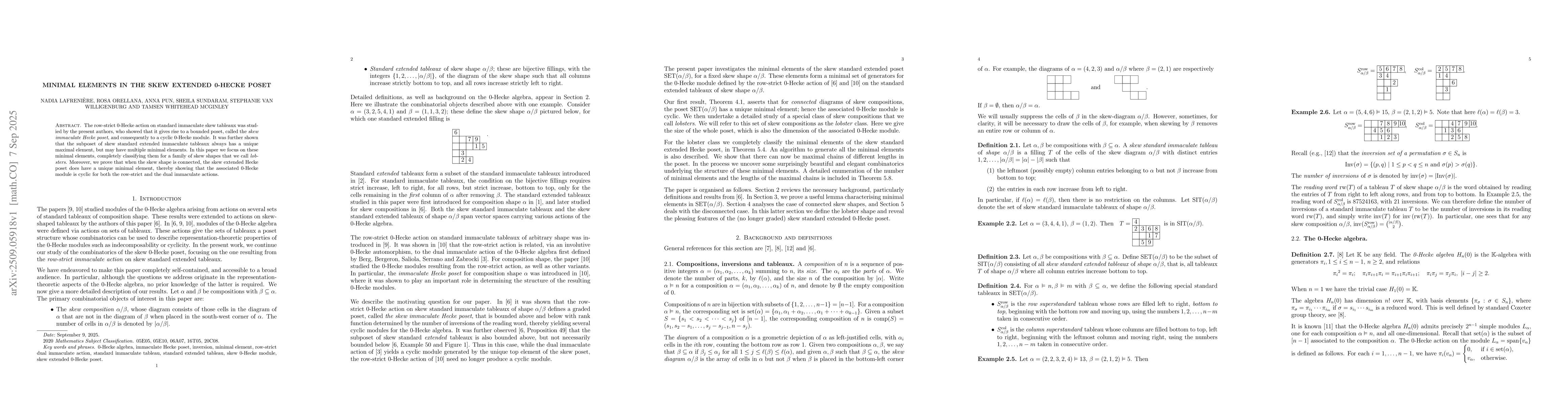 The row-strict 0-Hecke action on standard immaculate skew tableaux was studied by the present authors, who showed that it gives rise to a bounded poset, called the \emph{skew immaculate Hecke poset}, and consequently to a cyclic 0-Hecke module. It was further shown that the subposet of skew standard extended immaculate tableaux always has a unique maximal element, but may have multiple minimal elements. In this paper we focus on these minimal elements, completely classifying them for a family of skew shapes that we call \emph{lobsters}. Moreover, we prove that when the skew shape is connected, the skew extended Hecke poset does have a unique minimal element, thereby showing that the associated 0-Hecke module is cyclic for both the row-strict and the dual immaculate actions.