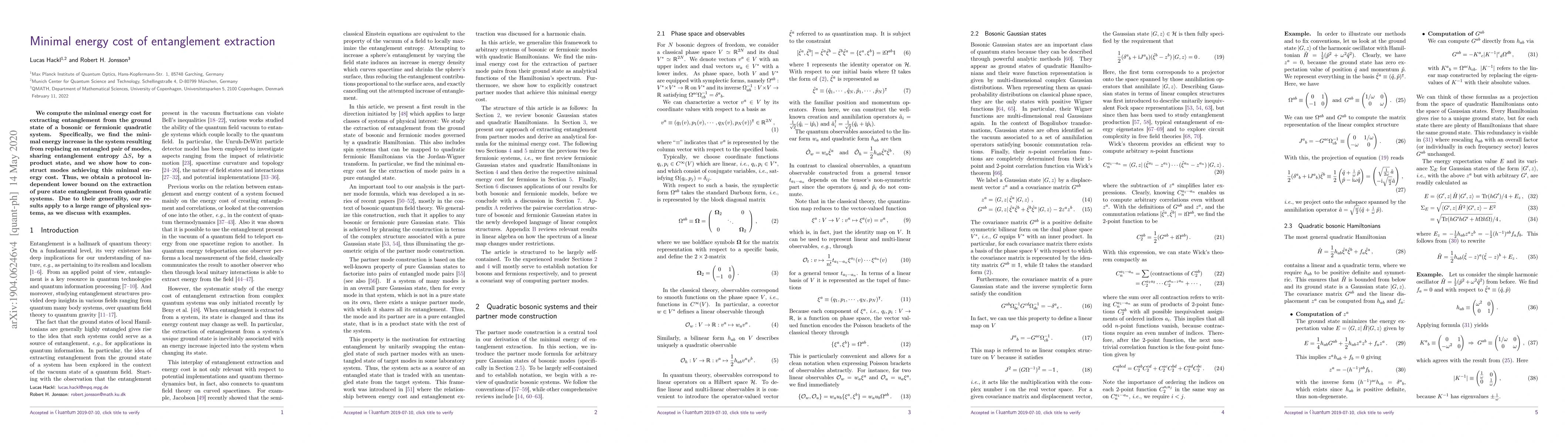 This paper determines the minimal energy cost, $\Delta E_{\mathrm{min}}$, for extracting entanglement from the ground state of bosonic or fermionic quadratic systems, providing a protocol-independent lower bound and demonstrating how to construct modes achieving this minimal energy increase. The findings are broadly applicable to various physical systems.