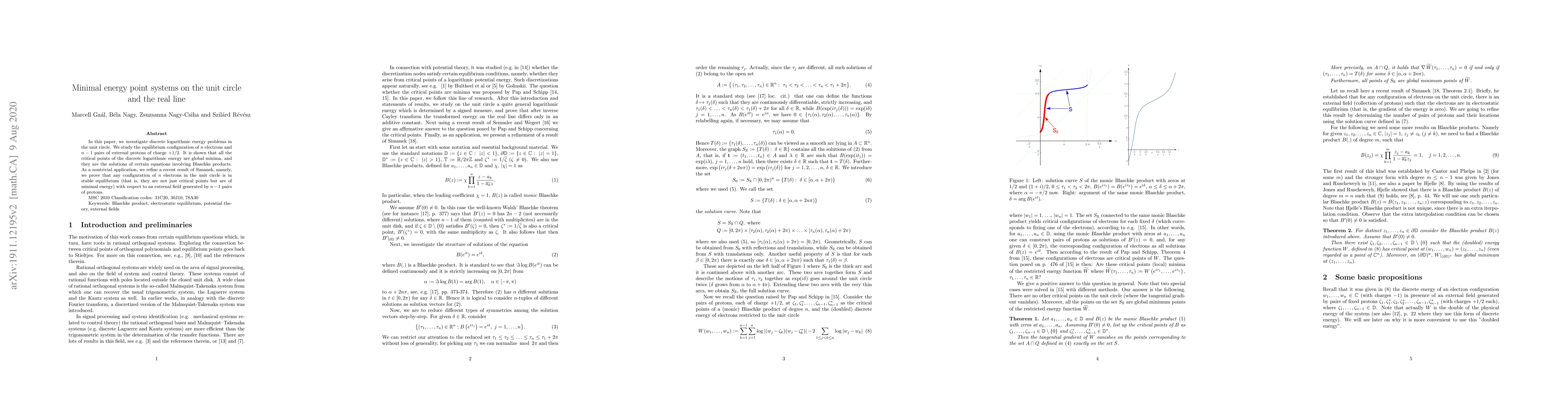 In this paper, we investigate discrete logarithmic energy problems in the unit circle. We study the equilibrium configuration of $n$ electrons and $n-1$ pairs of external protons of charge $+1/2$. It is shown that all the critical points of the discrete logarithmic energy are global minima, and they are the solutions of certain equations involving Blaschke products. As a nontrivial application, we refine a recent result of Simanek, namely, we prove that any configuration of $n$ electrons in the unit circle is in stable equilibrium (that is, they are not just critical points but are of minimal energy) with respect to an external field generated by $n-1$ pairs of protons.