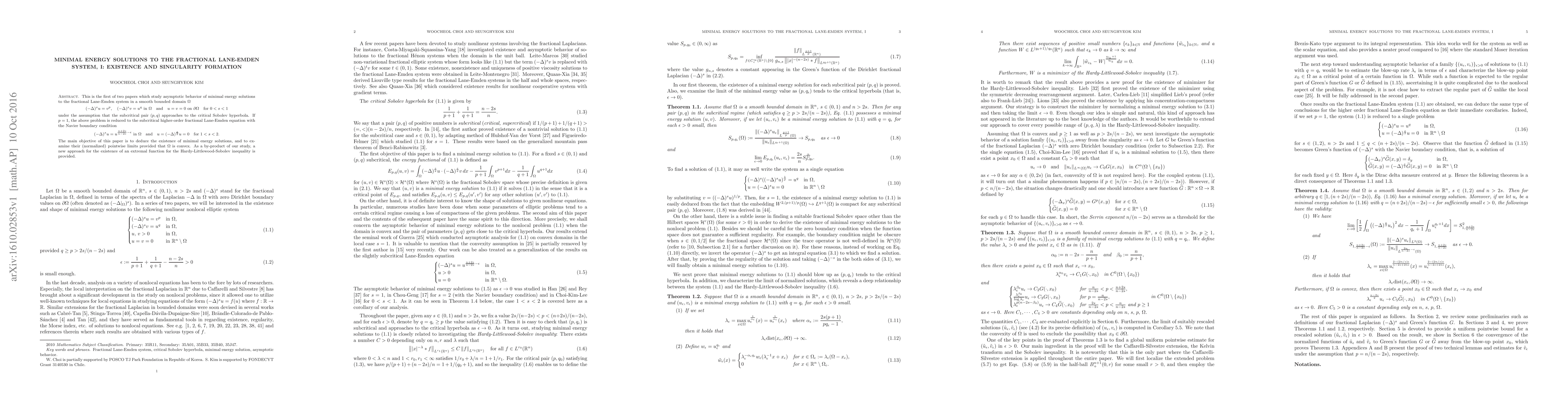 This paper investigates the existence of minimal energy solutions to the fractional Lane-Emden system and examines their singularity formation as the subcritical pair approaches the critical Sobolev hyperbola. A new approach for the existence of an extremal function for the Hardy-Littlewood-Sobolev inequality is also presented.