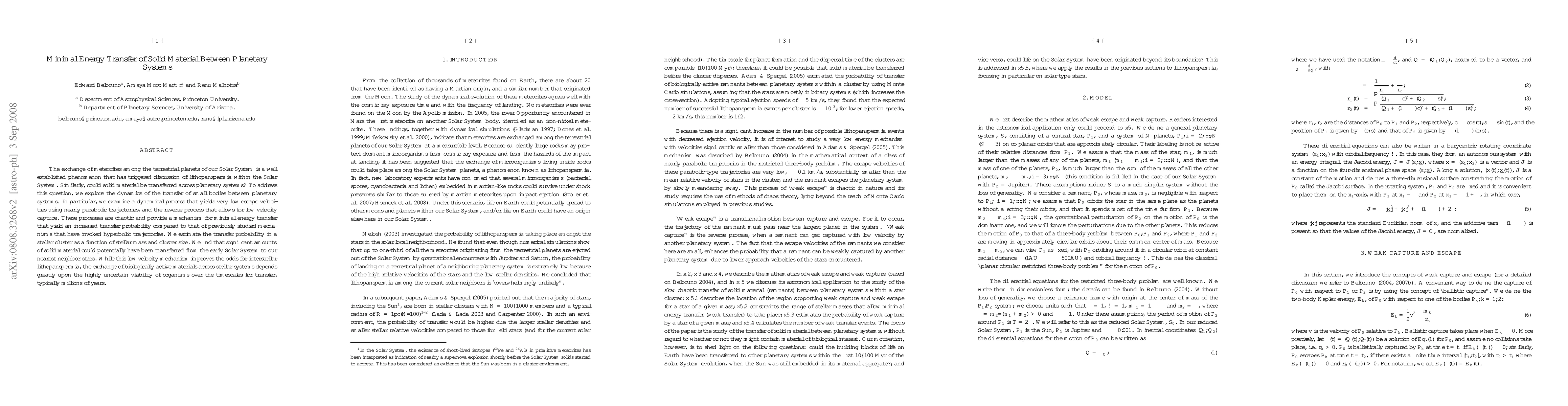 The exchange of meteorites among the terrestrial planets of our Solar System is a well established phenomenon that has triggered discussion of lithopanspermia within the Solar System. Similarly, could solid material be transferred across planetary systems? To address this question, we explore the dynamics of the transfer of small bodies between planetary systems. In particular, we examine a dynamical process that yields very low escape velocities using nearly parabolic trajectories, and the reverse process that allows for low velocity capture. These processes are chaotic and provide a mechanism for minimal energy transfer that yield an increased transfer probability compared to that of previously studied mechanisms that have invoked hyperbolic trajectories. We estimate the transfer probability in a stellar cluster as a function of stellar mass and cluster size. We find that significant amounts of solid material could potentially have been transferred from the early Solar System to our nearest neighbor stars. While this low velocity mechanism improves the odds for interstellar lithopanspermia, the exchange of biologically active materials across stellar systems depends greatly upon the highly uncertain viability of organisms over the timescales for transfer, typically millions of years.