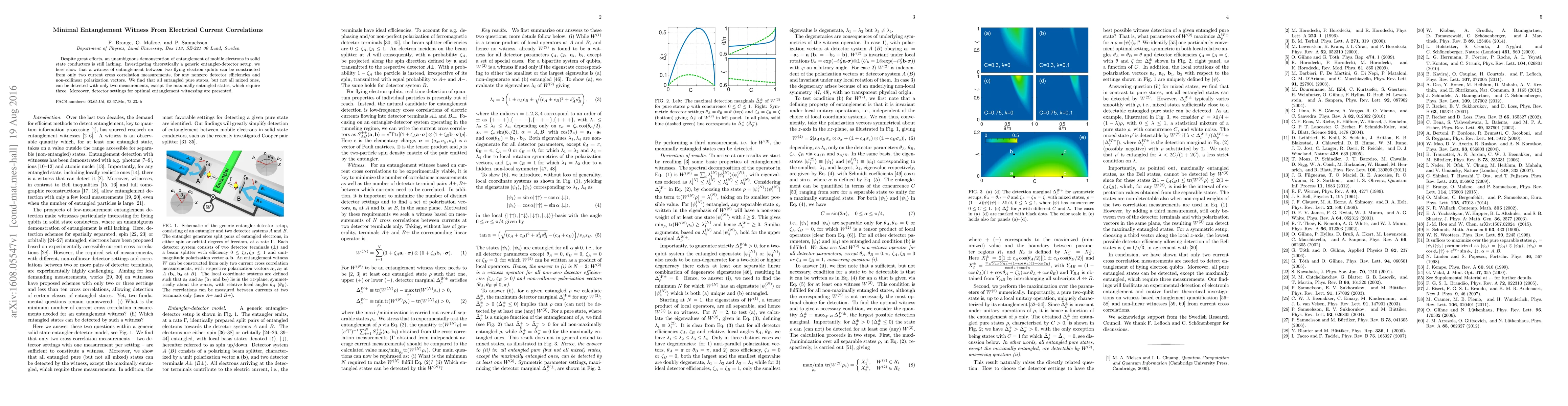 Despite great efforts, an unambiguous demonstration of entanglement of mobile electrons in solid state conductors is still lacking. Investigating theoretically a generic entangler-detector setup, we here show that a witness of entanglement between two flying electron qubits can be constructed from only two current cross correlation measurements, for any nonzero detector efficiencies and non-collinear polarization vectors. We find that all entangled pure states, but not all mixed ones, can be detected with only two measurements, except the maximally entangled states, which require three. Moreover, detector settings for optimal entanglement witnessing are presented.