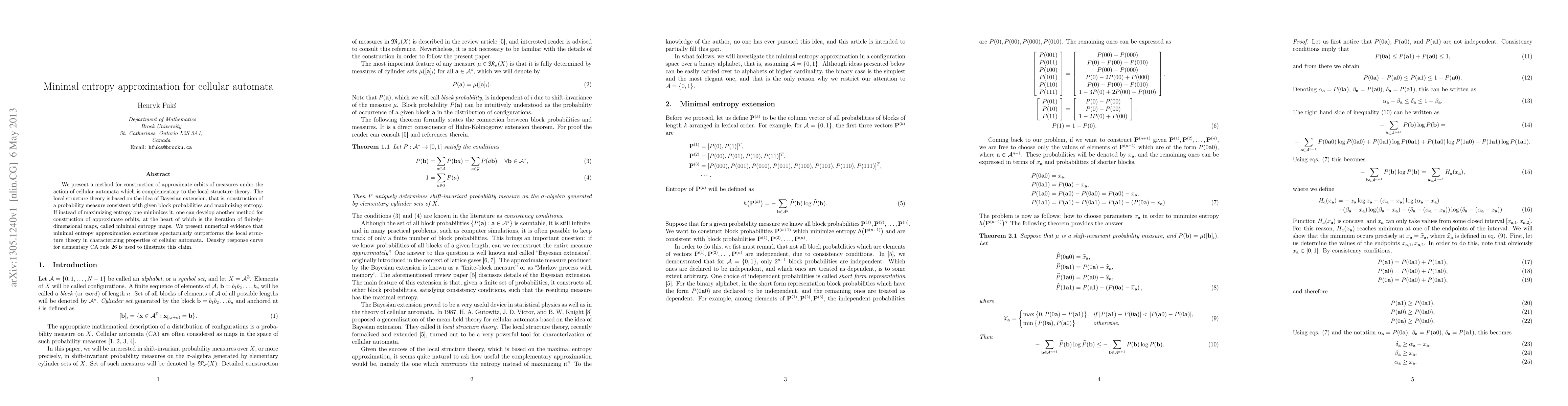 This paper introduces a minimal entropy approximation method for cellular automata, contrasting it with the local structure theory's Bayesian extension approach. It demonstrates that minimizing entropy can yield superior approximations, illustrated by the density response curve for elementary CA rule 26.