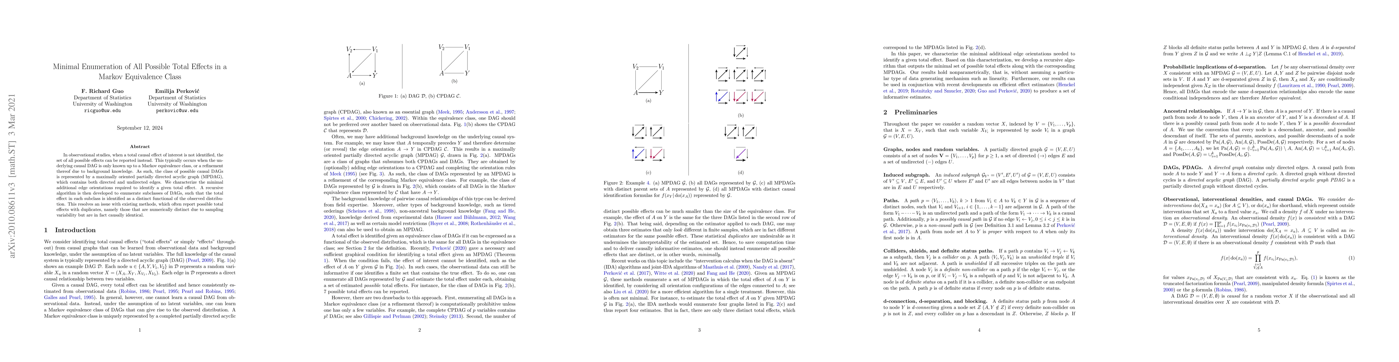 This paper proposes a method to enumerate all possible total effects in a Markov equivalence class without duplicates, using a recursive algorithm that identifies distinct functionals of the observed distribution. It addresses the issue of existing methods reporting numerically distinct but causally identical effects due to sampling variability.