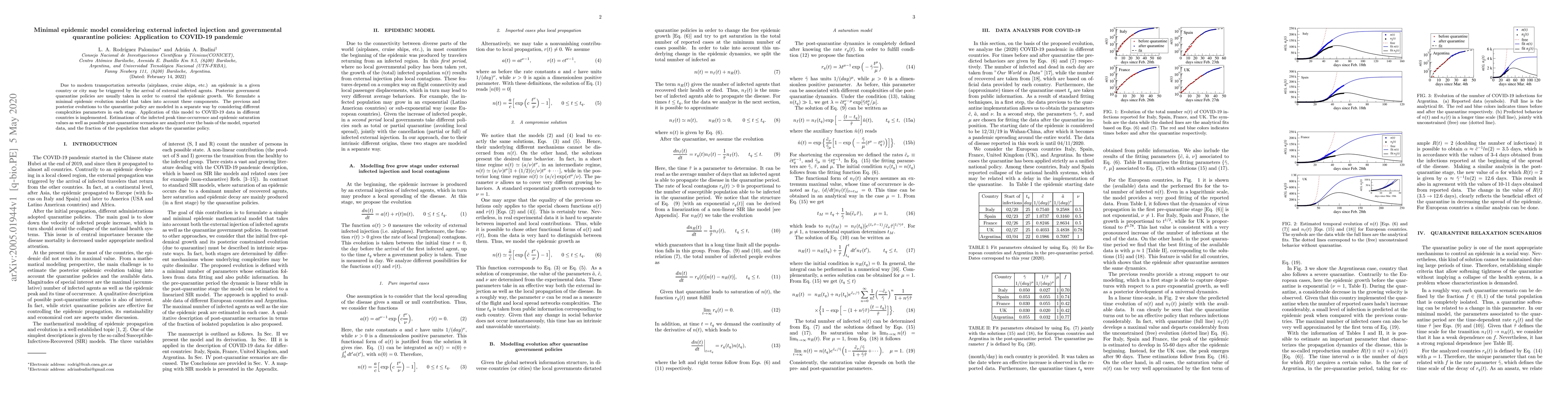 Due to modern transportation networks (airplanes, cruise ships, etc.) an epidemic in a given country or city may be triggered by the arrival of external infected agents. Posterior government quarantine policies are usually taken in order to control the epidemic growth. We formulate a minimal epidemic evolution model that takes into account these components. The previous and posterior evolutions to the quarantine policy are modeled in a separate way by considering different complexities parameters in each stage. Application of this model to COVID-19 data in different countries is implemented. Estimations of the infected peak time-occurrence and epidemic saturation values as well as possible post-quarantine scenarios are analyzed over the basis of the model, reported data, and the fraction of the population that adopts the quarantine policy.