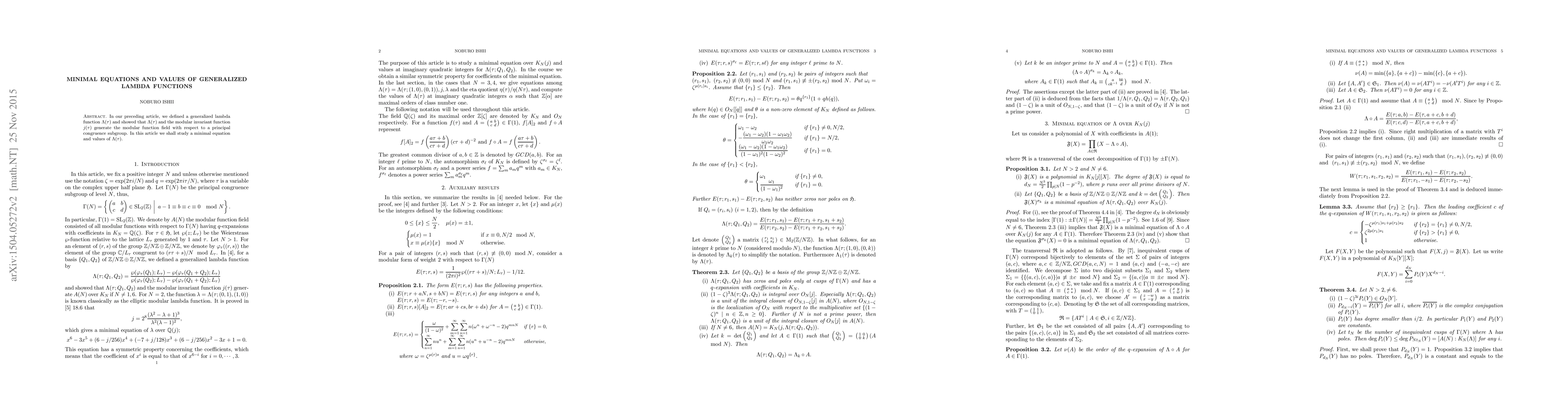 In our preceding article, we defined a generalized lambda function and showed that the genaralized lambda function and the modular invariant function generate the modular function field with respect to a principal congruence subgroup. In this article we shall study a minimal equation and values of the genaralized lambda function.