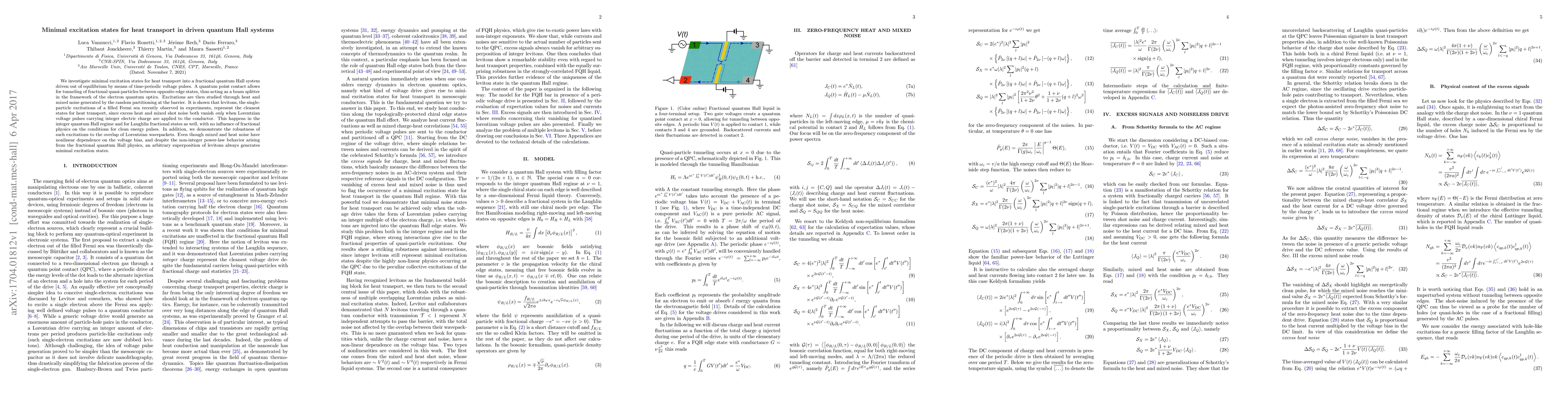 This paper explores minimal excitation states for heat transport in fractional quantum Hall systems driven by time-periodic voltage pulses. Levitons, single-particle excitations, are shown to provide the cleanest heat transport, minimizing excess heat and mixed shot noise, regardless of fractional physics, in both integer and fractional quantum Hall regimes.