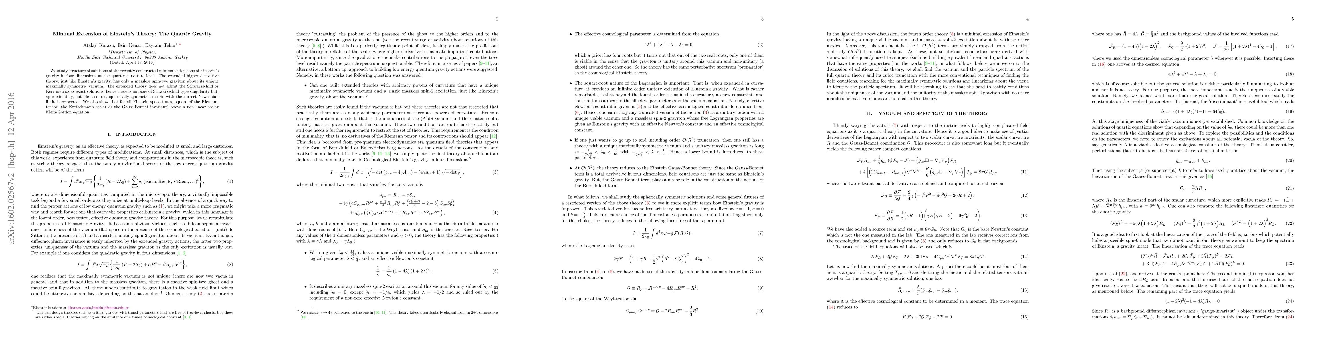 We study structure of solutions of the recently constructed minimal extensions of Einstein's gravity in four dimensions at the quartic curvature level. The extended higher derivative theory, just like Einstein's gravity, has only a massless spin-two graviton about its unique maximally symmetric vacuum. The extended theory does not admit the Schwarzschild or Kerr metrics as exact solutions, hence there is no issue of Schwarzschild type singularity but, approximately, outside a source, spherically symmetric metric with the correct Newtonian limit is recovered. We also show that for all Einstein space-times, square of the Riemann tensor (the Kretschmann scalar or the Gauss-Bonnet invariant) obeys a non-linear scalar Klein-Gordon equation.