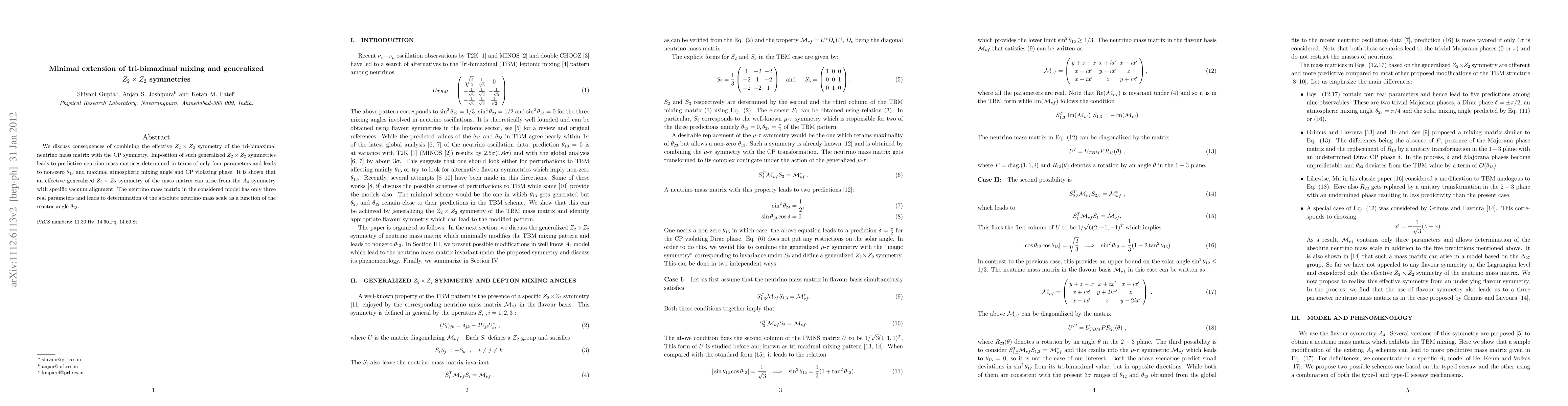This paper explores the consequences of integrating $Z_2\times Z_2$ symmetry into tri-bimaximal neutrino mixing, predicting a four-parameter neutrino mass matrix with non-zero $\theta_{13}$, maximal atmospheric mixing, and CP violation. It also demonstrates how such symmetry can emerge from $A_4$ symmetry with specific vacuum alignments.