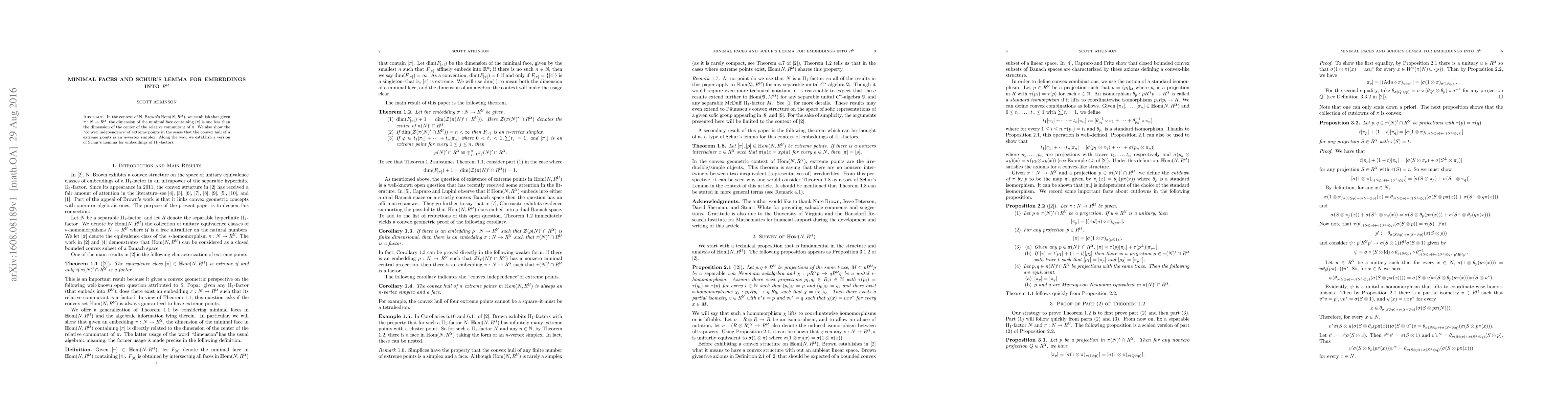 This paper explores the dimension of minimal faces in N. Brown's Hom(N,R^U) and establishes a connection between these dimensions and the center of the relative commutant of embeddings. It also demonstrates the "convex independence" of extreme points and proves a version of Schur's Lemma for embeddings of II$_1$-factors.