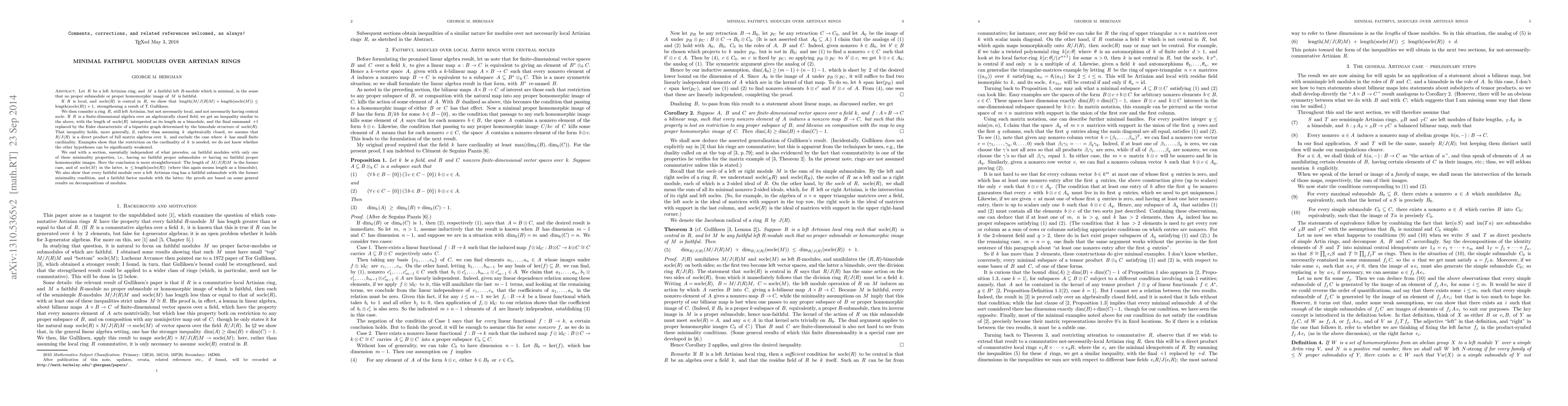 This paper investigates minimal faithful modules over left Artinian rings, focusing on their structure when the ring is local with a central socle. It establishes an inequality relating the lengths of certain module components, strengthening prior results. For non-local rings, it provides similar inequalities under specific conditions, notably when the ring is a finite-dimensional algebra over an algebraically closed field or a direct product of matrix algebras. The paper concludes with bounds on faithful modules with one minimality property and proves the existence of faithful submodules and factor modules.