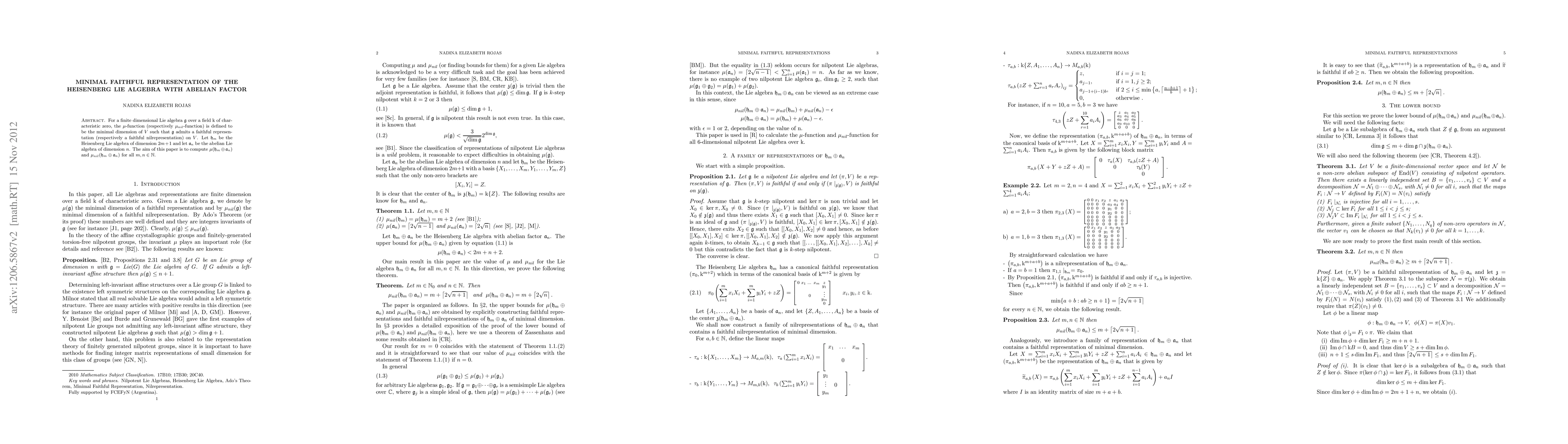 This paper computes the minimal faithful representation dimension ($\mu$-function) and the minimal faithful nilrepresentation dimension ($\mu_{nil}$-function) for the direct sum of the Heisenberg Lie algebra $\h_m$ and the abelian Lie algebra $\mathfrak{a}_n$ over a field of characteristic zero.