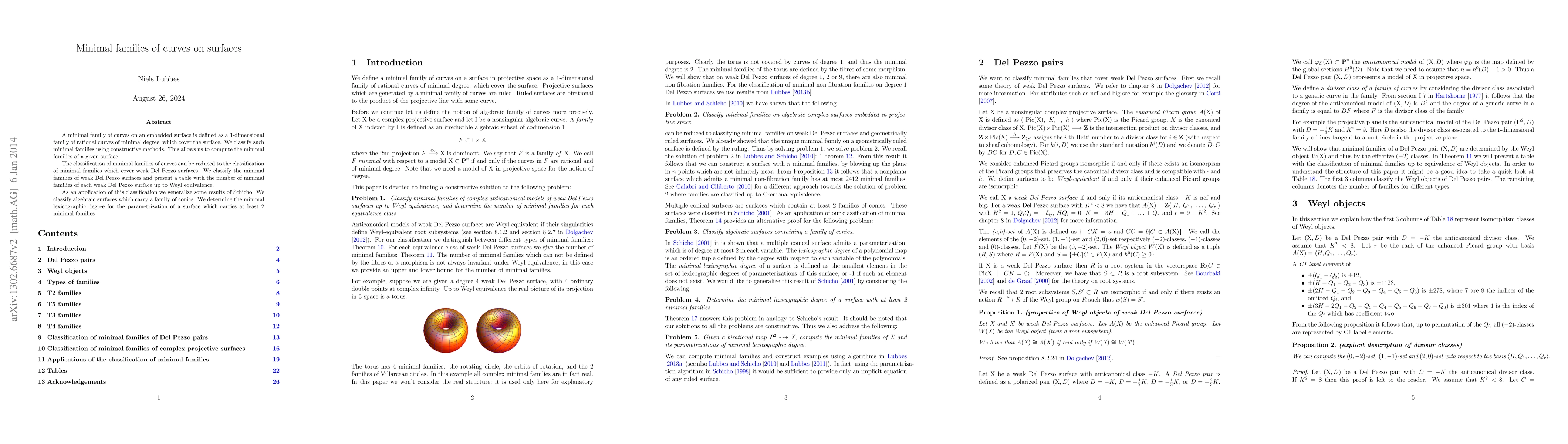 A minimal family of curves on an embedded surface is defined as a 1-dimensional family of rational curves of minimal degree, which cover the surface. We classify such minimal families using constructive methods. This allows us to compute the minimal families of a given surface. The classification of minimal families of curves can be reduced to the classification of minimal families which cover weak Del Pezzo surfaces. We classify the minimal families of weak Del Pezzo surfaces and present a table with the number of minimal families of each weak Del Pezzo surface up to Weyl equivalence. As an application of this classification we generalize some results of Schicho. We classify algebraic surfaces which carry a family of conics. We determine the minimal lexicographic degree for the parametrization of a surface which carries at least 2 minimal families.