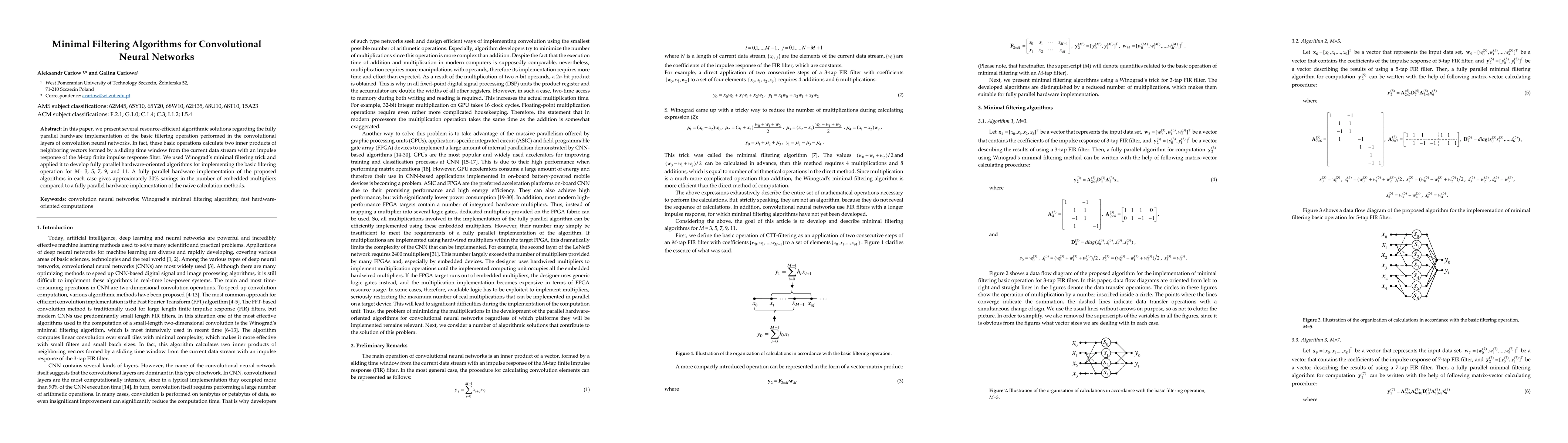 This paper introduces resource-efficient algorithms for the fully parallel hardware implementation of convolutional neural network filtering operations, leveraging the Winograd minimal filtering trick. The proposed methods achieve approximately 30% savings in embedded multipliers compared to traditional methods.