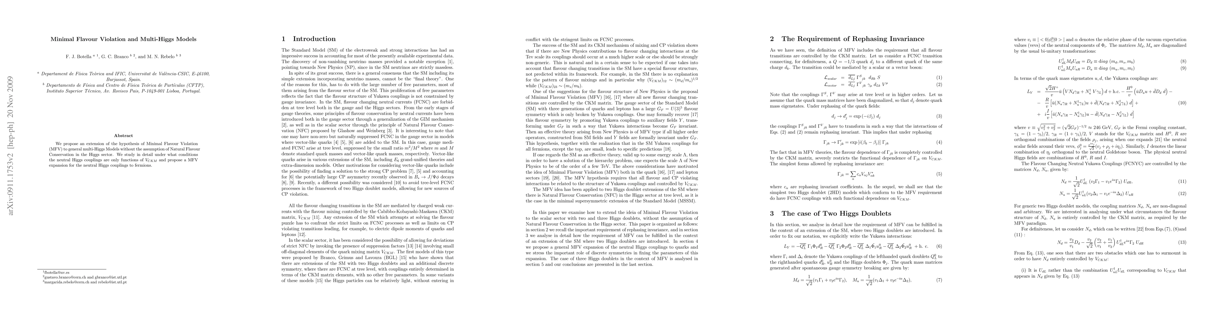 This paper extends the Minimal Flavour Violation (MFV) hypothesis to multi-Higgs models, proposing that neutral Higgs couplings can be functions solely of the Cabibbo-Kobayashi-Maskawa (CKM) matrix, without assuming natural flavour conservation. It provides a detailed MFV expansion for neutral Higgs couplings to fermions.