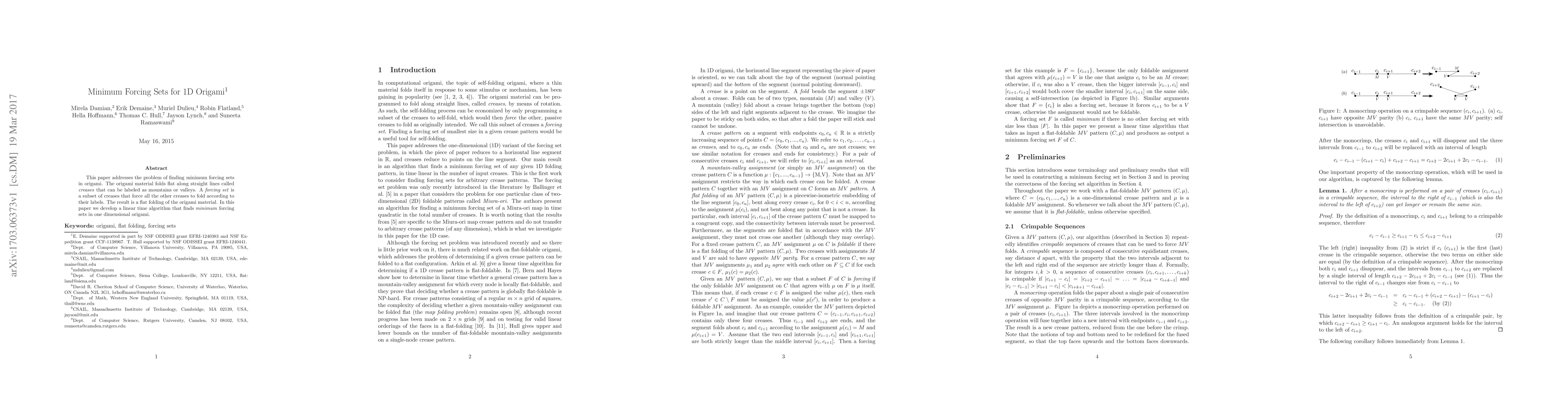 This paper addresses the problem of finding minimum forcing sets in origami. The origami material folds flat along straight lines called creases that can be labeled as mountains or valleys. A forcing set is a subset of creases that force all the other creases to fold according to their labels. The result is a flat folding of the origami material. In this paper we develop a linear time algorithm that finds minimum forcing sets in one dimensional origami.