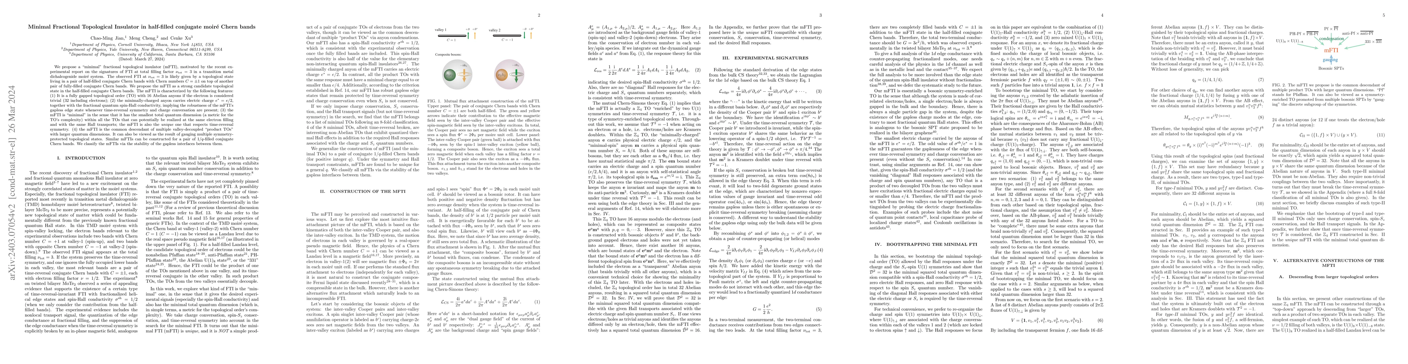 We propose a "minimal" fractional topological insulator (mFTI), motivated by the recent experimental report on the signatures of FTI at total filling factor $\nu_{\rm tot} = 3$ in a transition metal dichalcogenide moir\'{e} system. The observed FTI at $\nu_{\rm tot} = 3$ is likely given by a topological state living in a pair of half-filled conjugate Chern bands with Chern numbers $C=\pm 1$ on top of another pair of fully-filled conjugate Chern bands. We propose the mFTI as a strong candidate topological state in the half-filled conjugate Chern bands. The mFTI is characterized by the following features: (1) It is a fully gapped topological order (TO) with 16 Abelian anyons if the electron is considered trivial (32 including electrons); (2) the minimally-charged anyon carries electric charge $e^\ast = e/2$, together with the fractional quantum spin-Hall conductivity, implying the robustness of the mFTI's gapless edge state whenever time-reversal symmetry and charge conversation are present; (3) the mFTI is "minimal" in the sense that it has the smallest total quantum dimension (a metric for the TO's complexity) within all the TOs that can potentially be realized at the same electron filling and with the same Hall transports; the mFTI is also the unique one that respects time-reversal symmetry. (4) the mFTI is the common descendant of multiple valley-decoupled "product TOs" with larger quantum dimensions. It can also be viewed as the result of gauging multiple symmetry-protected topological states. Similar mFTIs can be constructed for a pair of $1/q$-filled conjugate Chern bands. We classify the mFTIs via the stability of the gapless interfaces between them.