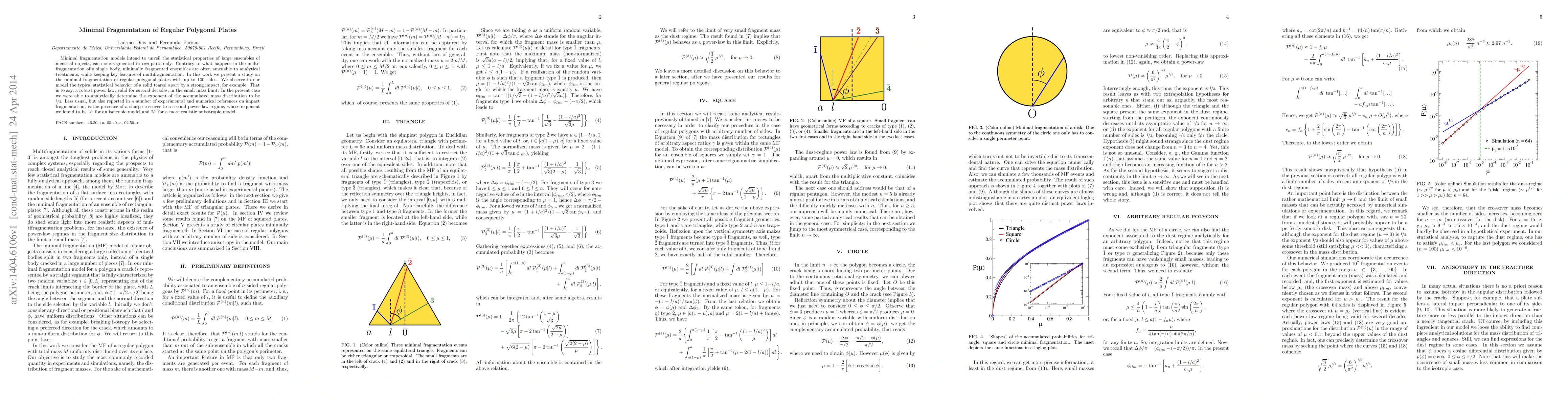 Researchers studied the minimal fragmentation of regular polygonal plates with up to 100 sides, finding a robust power law in mass distribution with exponents of 1/2 and 1/3 for isotropic and anisotropic models respectively.