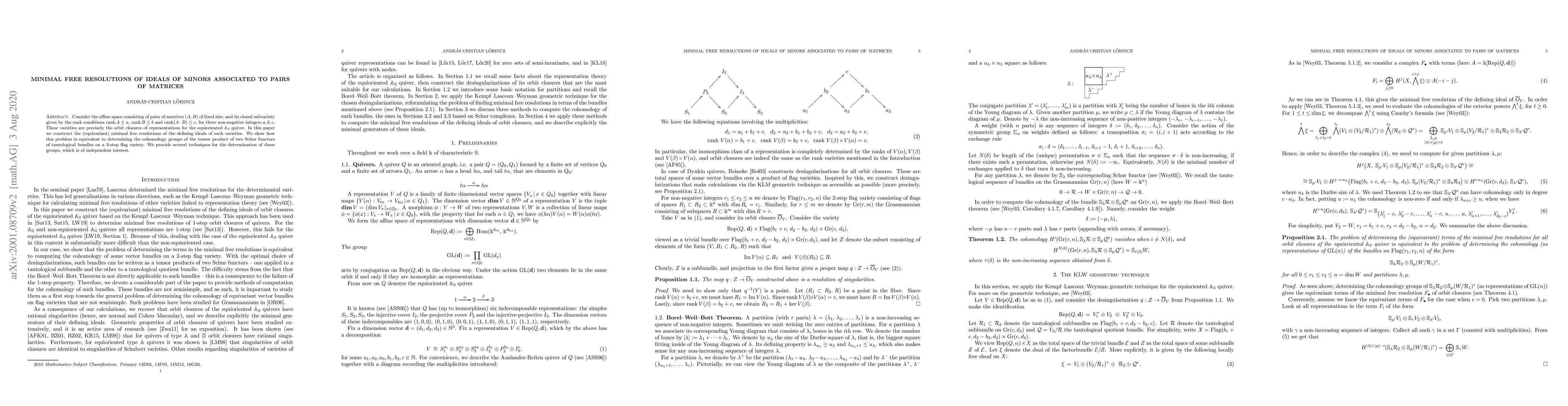 Consider the affine space consisting of pairs of matrices $(A,B)$ of fixed size, and its closed subvariety given by the rank conditions $\operatorname{rank} A \leq a$, $\operatorname{rank} B \leq b$ and $\operatorname{rank} (A\cdot B) \leq c$, for three non-negative integers $a,b,c$. These varieties are precisely the orbit closures of representations for the equioriented $A_3$ quiver. In this paper we construct the (equivariant) minimal free resolutions of the defining ideals of such varieties. We show how this problem is equivalent to determining the cohomology groups of the tensor product of two Schur functors of tautological bundles on a 2-step flag variety. We provide several techniques for the determination of these groups, which is of independent interest.